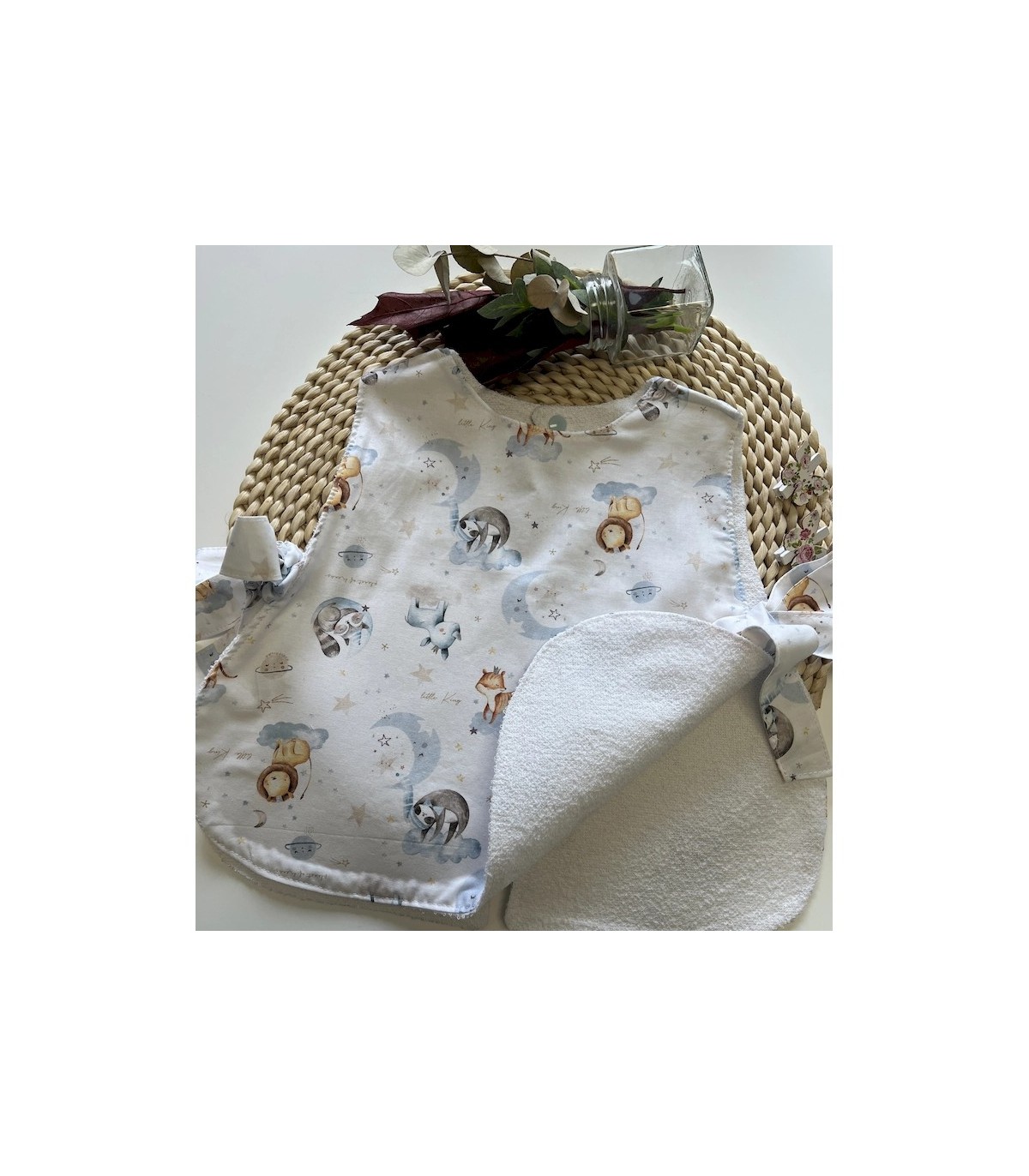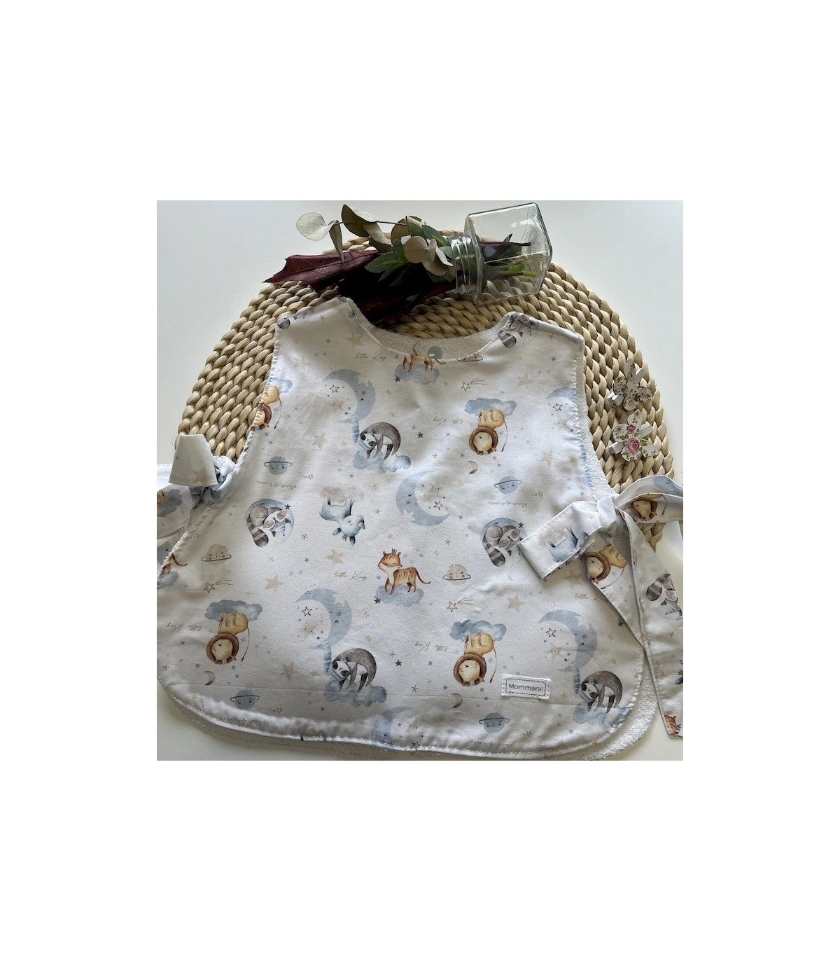 Nuestro babero impermeable con detalle de animalitos combina practicidad y encanto a partes iguales. El tejido exterior es de algodón 100%, suave y agradable al tacto, con un delicado estampado de animalitos que enamora. En el interior, lleva un forro de algodón 100% impermeable, que evita que la humedad traspase y mantiene la ropita del bebé siempre seca.