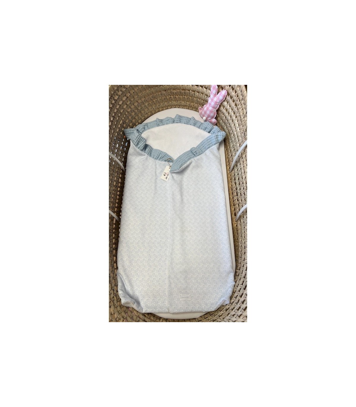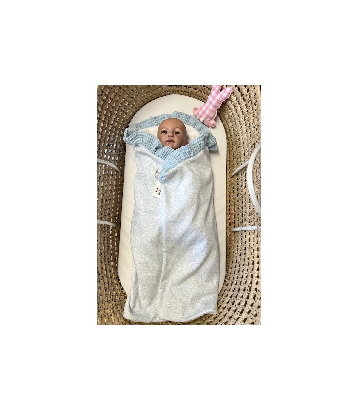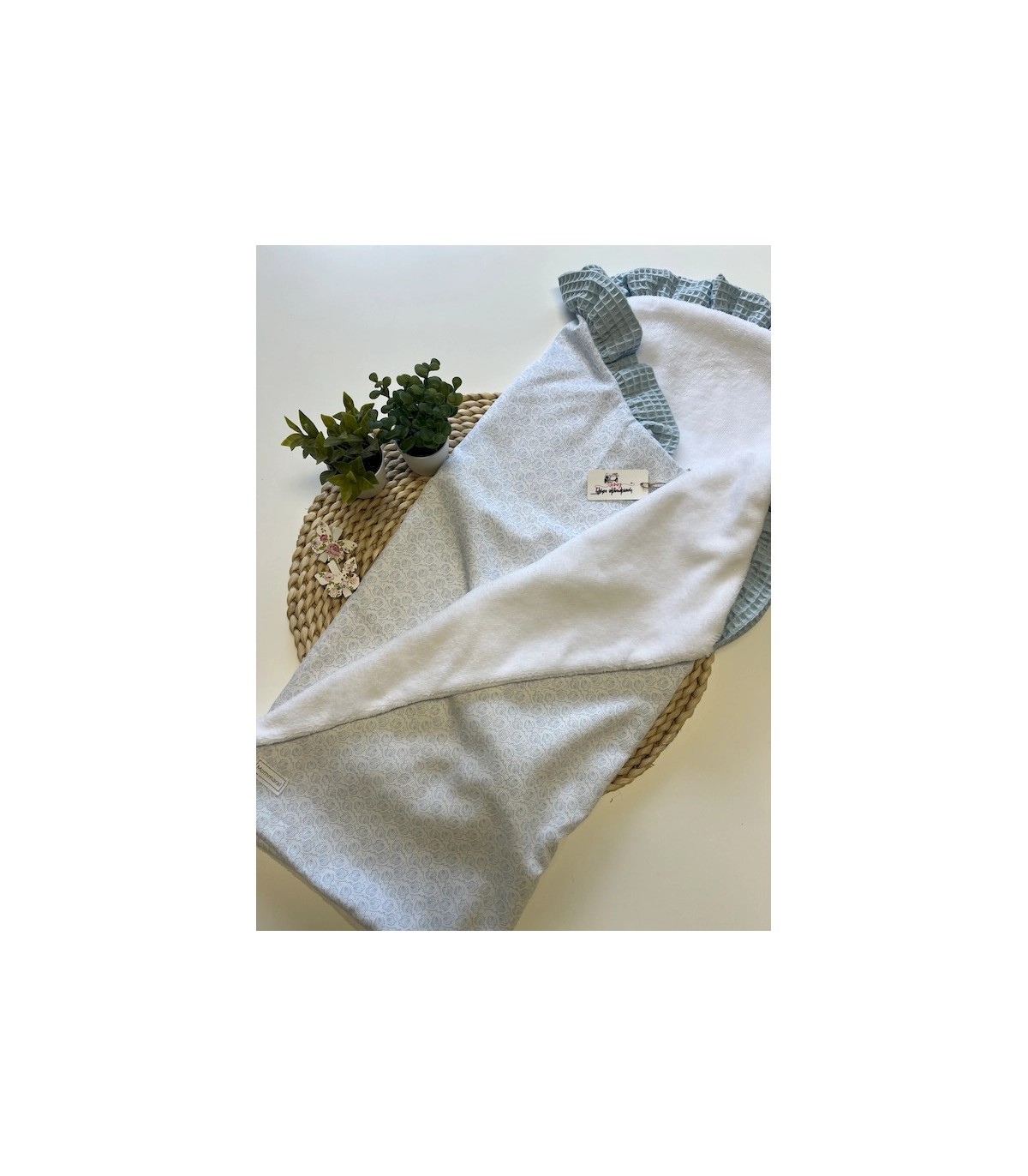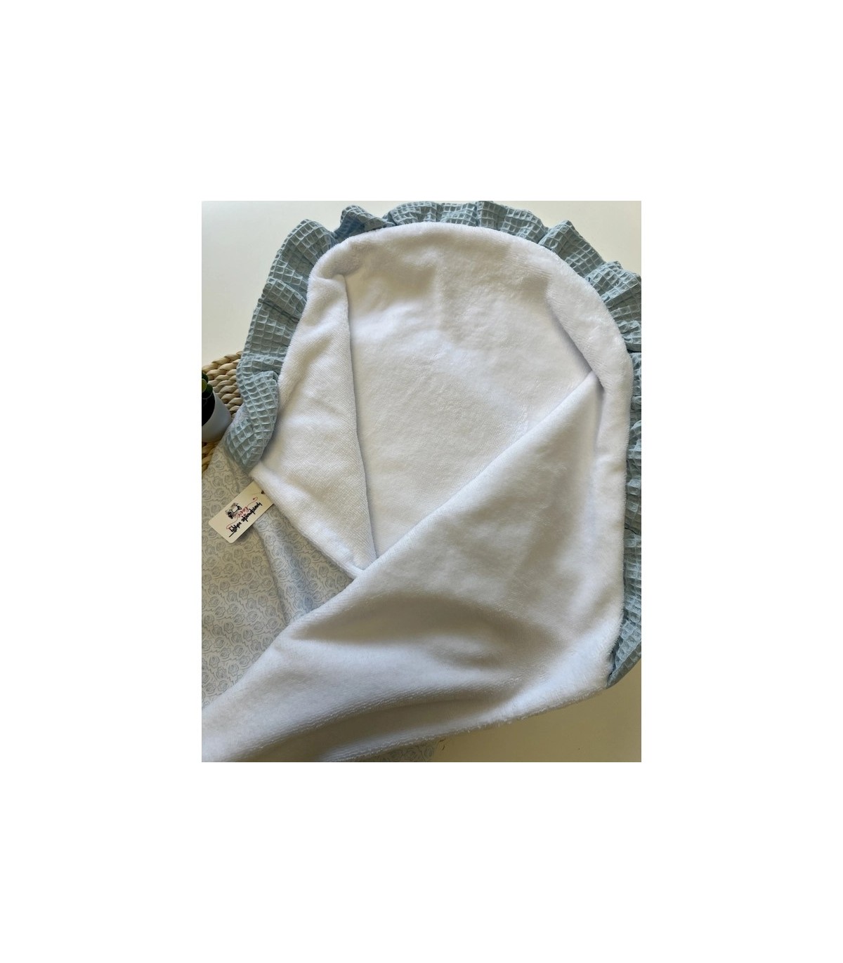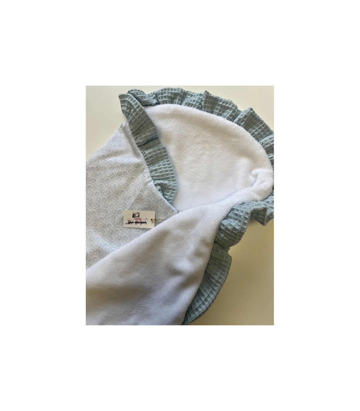 Arrullo hecho a mano con exterior de piqué 100% algodón y suave interior de rizo de bambú. Detalle de volante en tejido Waffle azul que aporta un toque delicado y elegante. Ideal para envolver y abrigar al bebé desde el nacimiento.