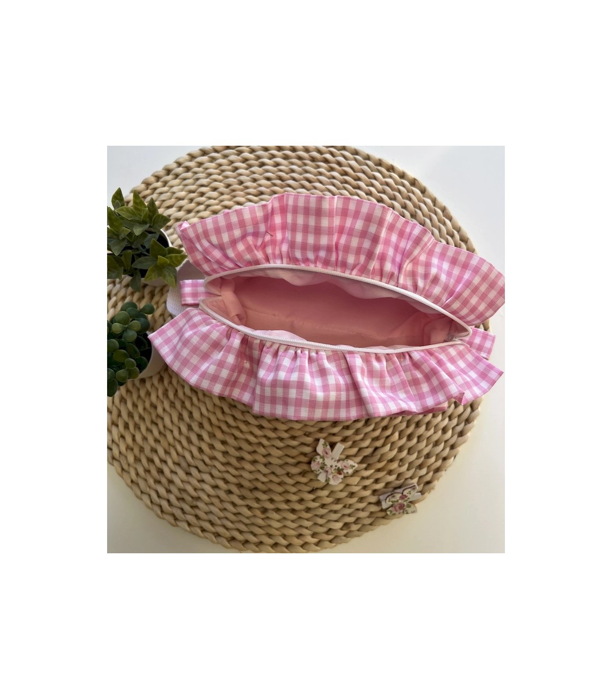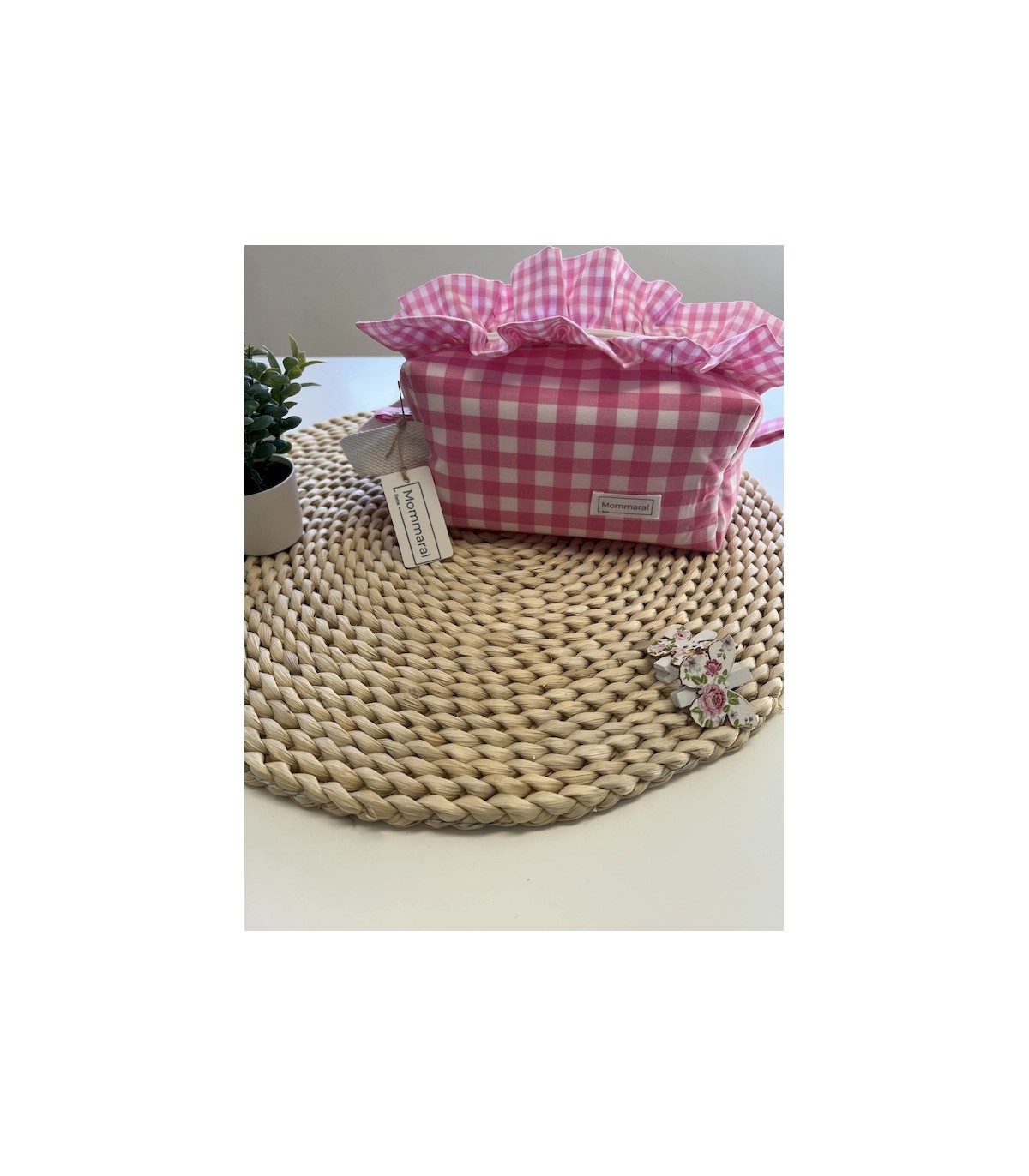 Neceser hecho a mano por Mommaral Bebe, con exterior de vichy cuadros rosa algodón 100% y forro interior de popelín de algodón en rosa. Detalle de volante en la parte de la cremallera haciendo del neceser con más estilo. Tamaño aprox. 30x40 cm, cierre con cremallera, dos asitas laterales para facilitar la apertura y un asa de algodón 100% para transportar. Ideal para llevar las cremas, chupetes… los imprescindibles de tu bebé. Lavable en agua fría. Envío en 2-5 días hábiles si hay stock, o 7-10 días si se confecciona bajo pedido.