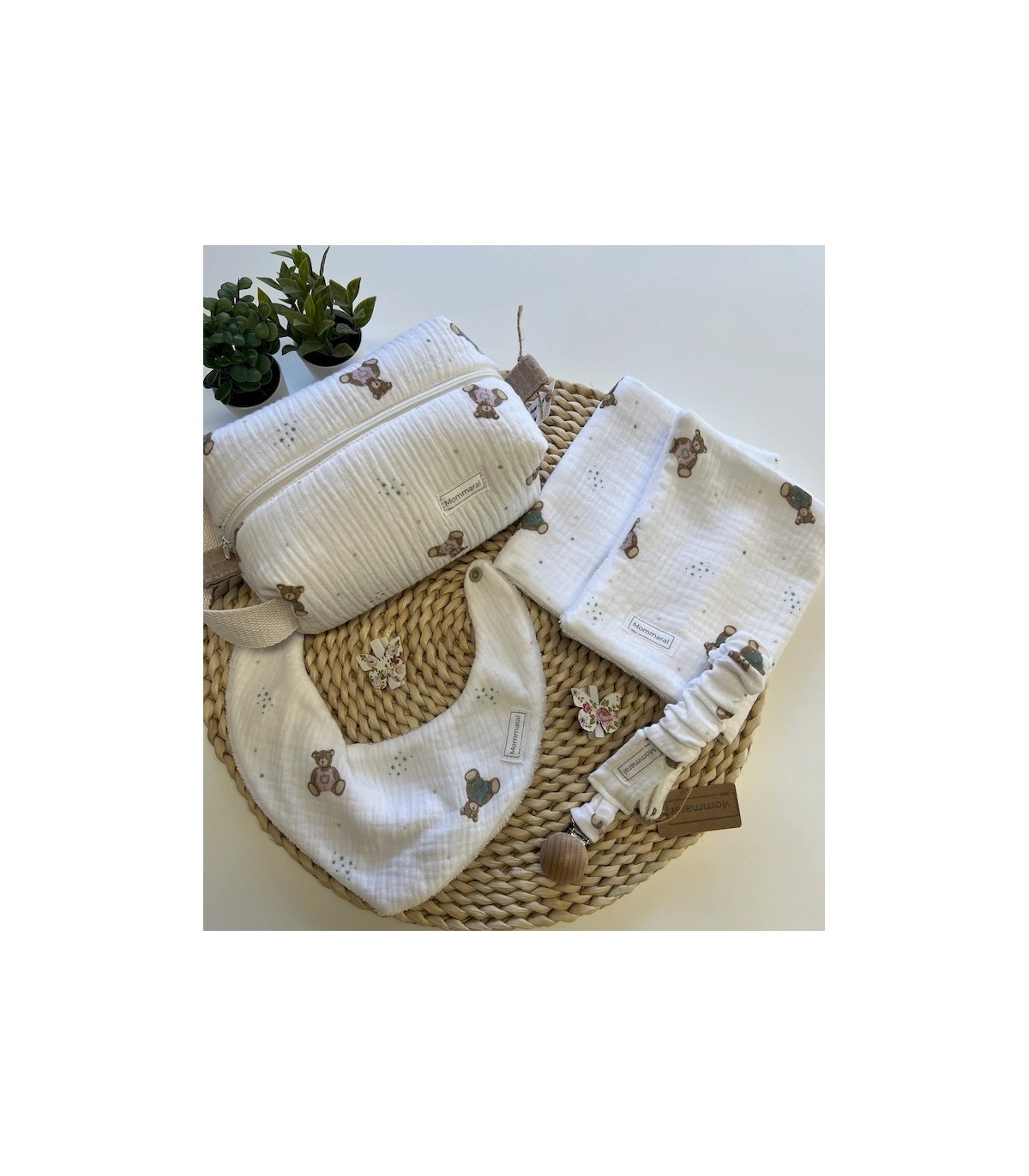 - Neceser (aprox. 25x35 cm): confeccionado con muselina estampada de ositos en el exterior y tejido Waffle color canela en el interior. Cuenta con asas laterales para facilitar la apertura y cierre, y cinta de algodón para un cómodo transporte.