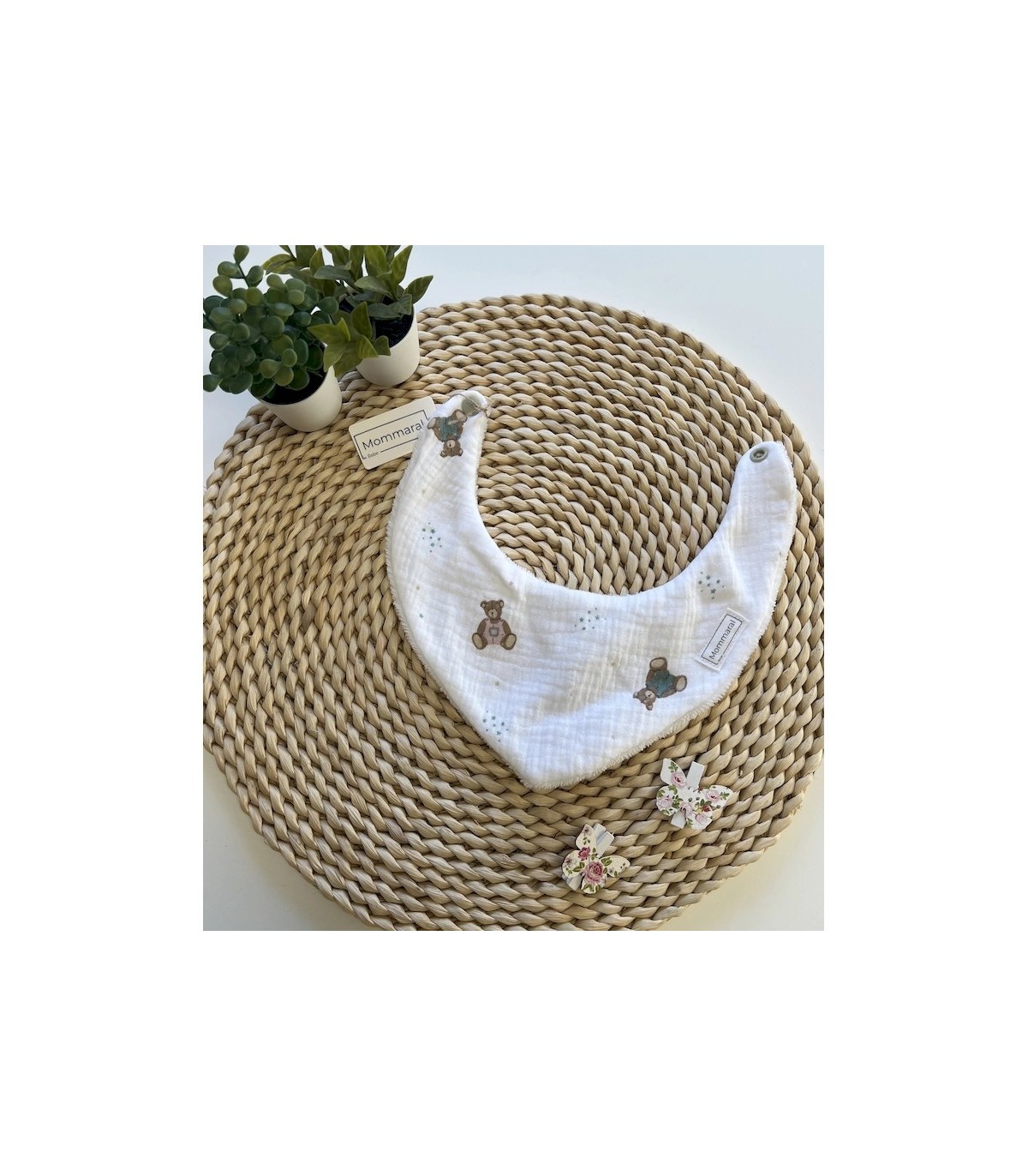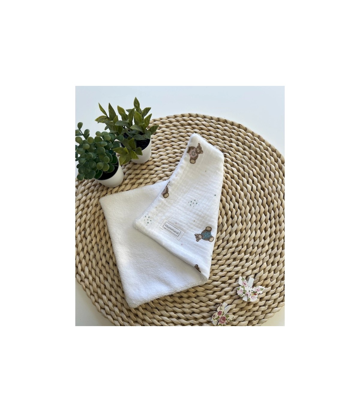 - Babero y toallitas salvababitas: elaborados con muselina de ositos y rizo de bambú, muy suaves y absorbentes perfectos para el día a día del bebé.