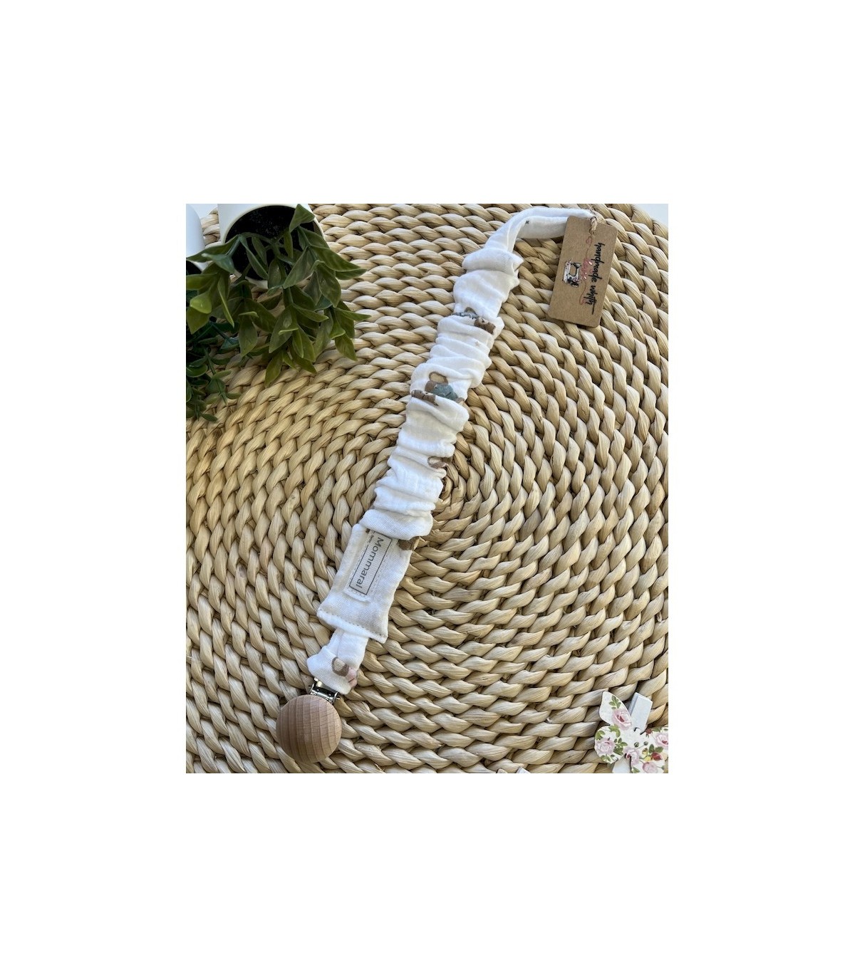 - Chupetero: con goma elástica y clip de madera, práctico y seguro para sujetar el chupete.