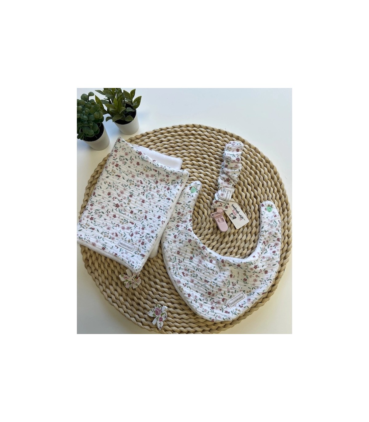 Conjunto hecho a mano compuesto por babero, toallita salvababitas y chupetero, confeccionados con muselina de algodón y suave rizo de bambú. Un set práctico, delicado y natural, perfecto para el cuidado diario del bebé.