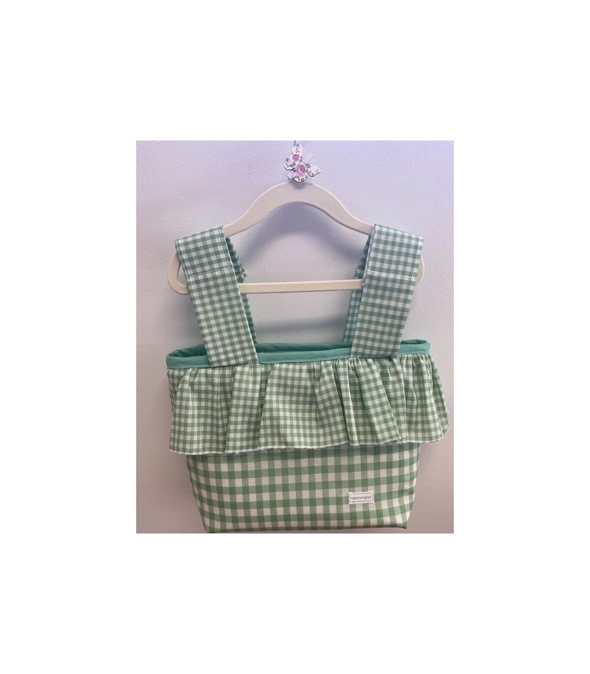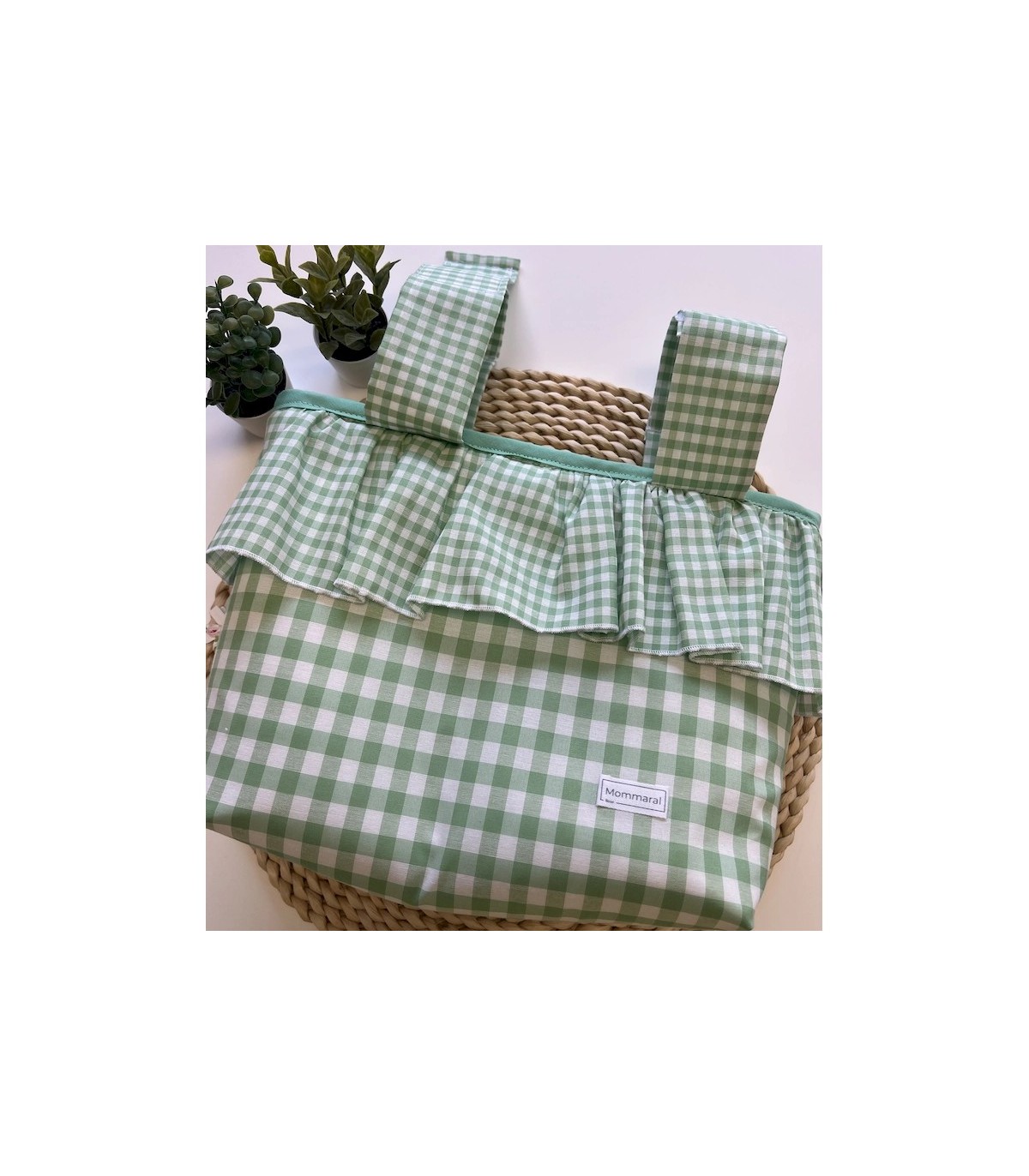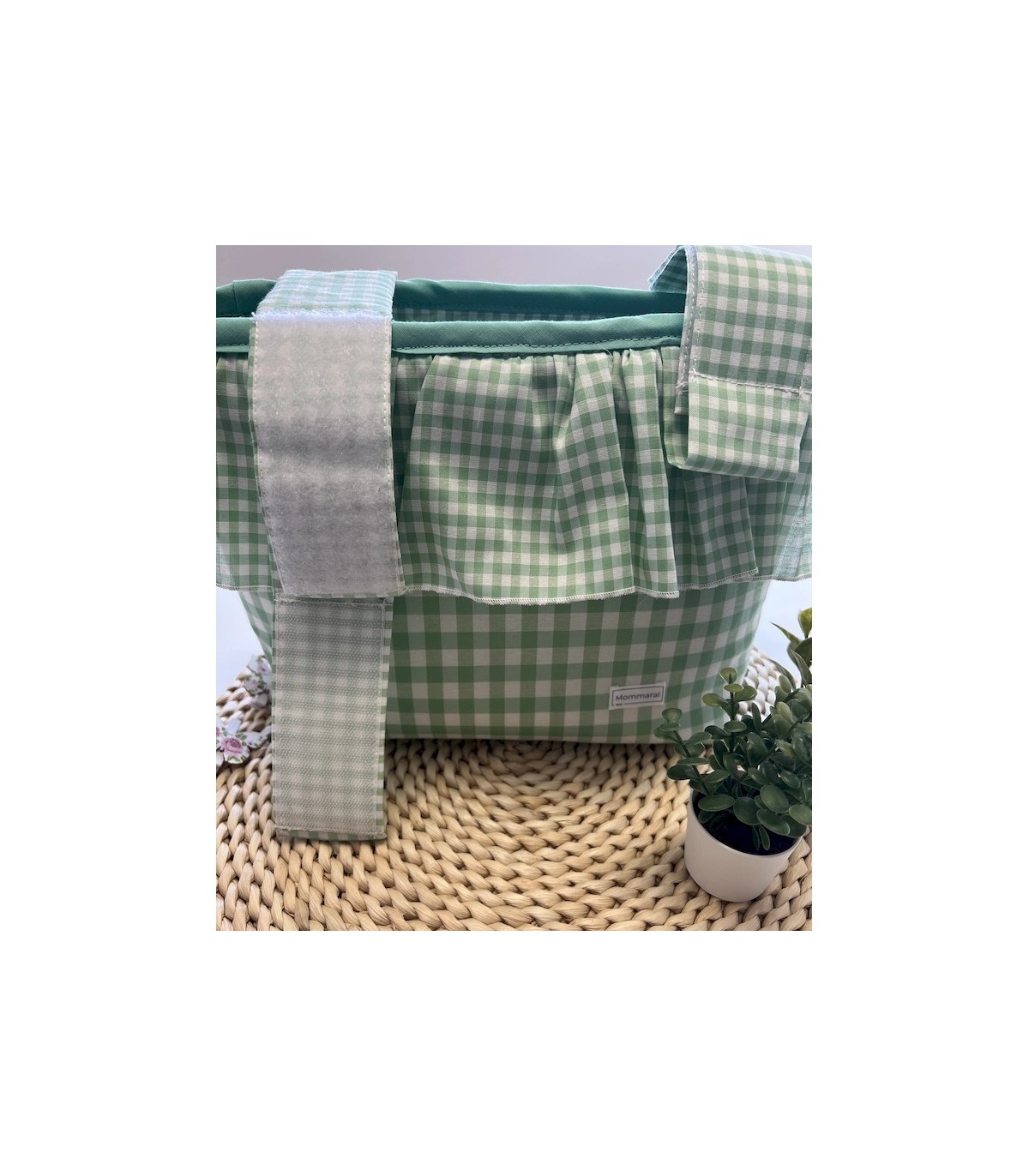 Este bolso bombonera para carrito está confeccionado a mano con un precioso tejido vichy verde, aportando un toque clásico y dulce al paseo del bebé.