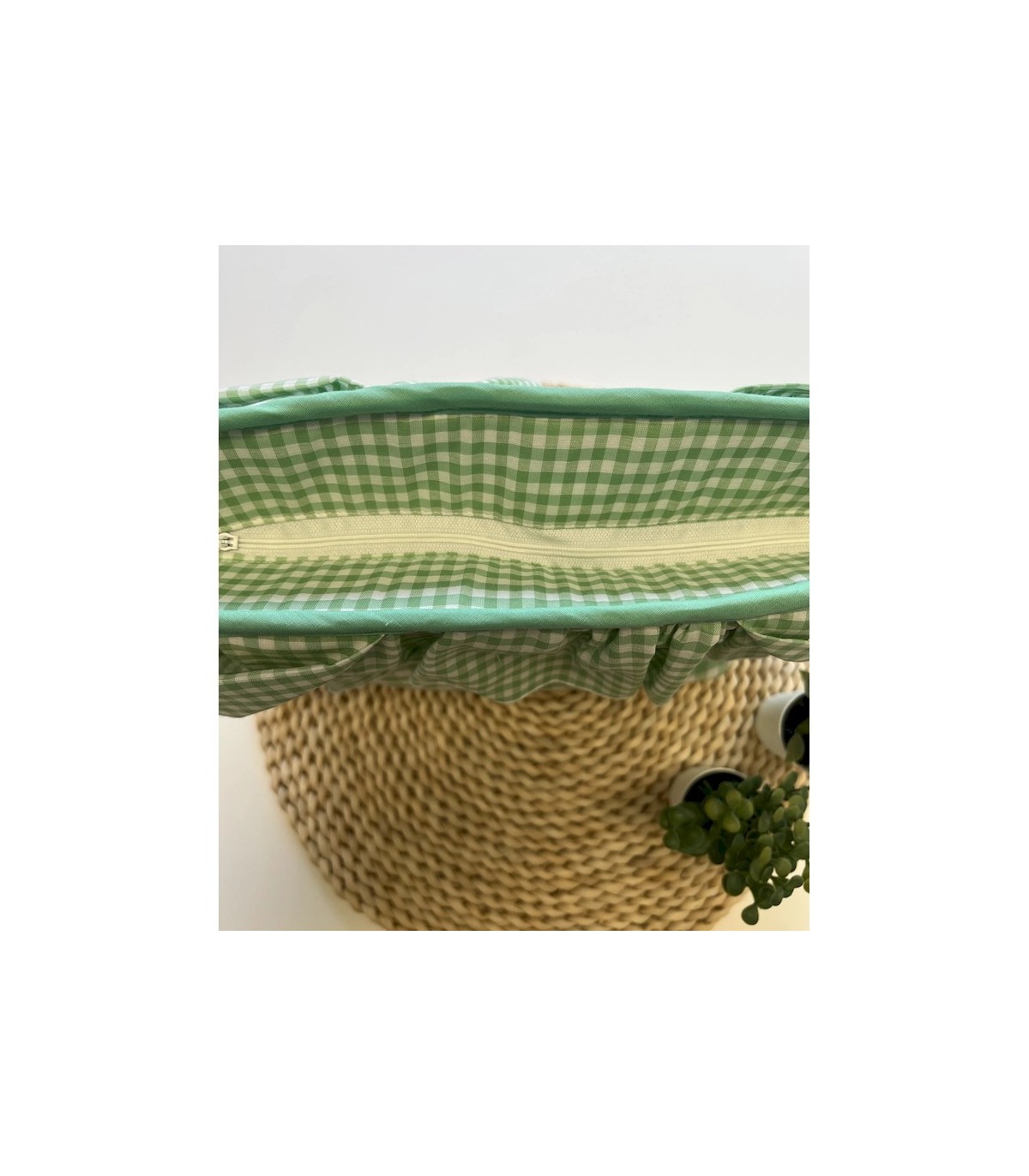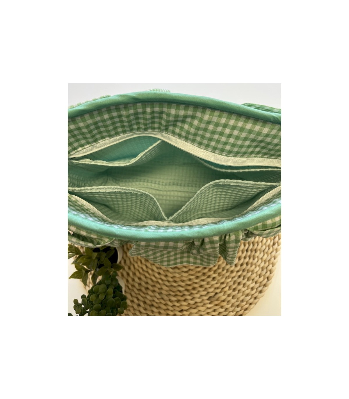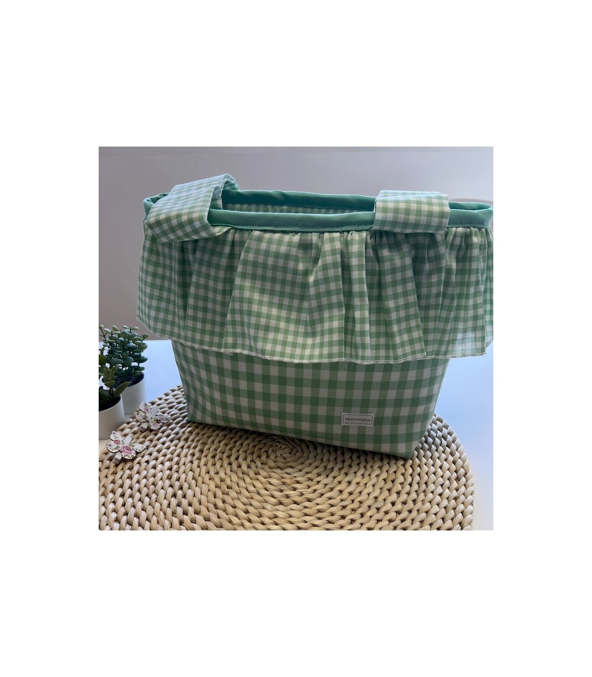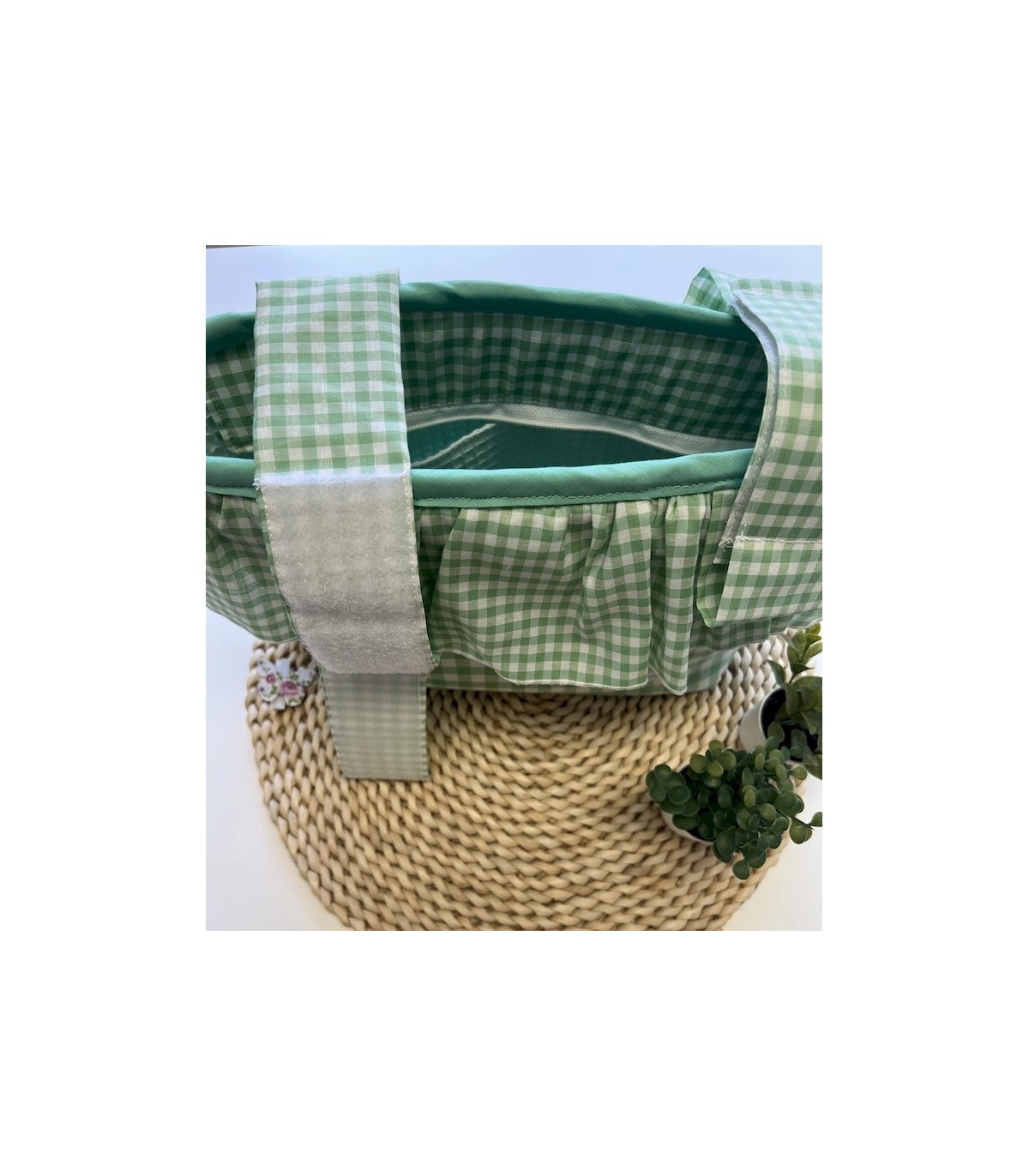 Bolso bombonera para carrito en vichy verde, hecho a mano. Con volante decorativo, asas con velcro resistente, interior forrado en waffle verde mar, bolsillos organizadores y cierre con cremallera. Práctico, elegante y lavable a máquina. Medidas: 38x29 cm aproximadamente.