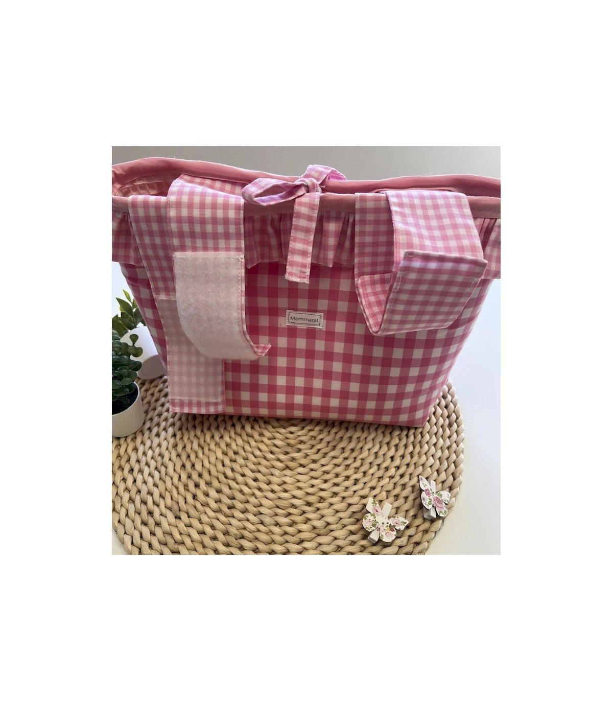 Bolso bombonera para carrito en vichy rosa, hecho a mano. Con volante decorativo, asas con velcro resistente, interior forrado en waffle rosa, bolsillos organizadores, elástico ancho en un lateral para llevar sujeto biberón, botella agua, termo, dosificadoress comida.... Práctico, elegante y lavable a máquina. Medidas: 38x29 cm aproximadamente.