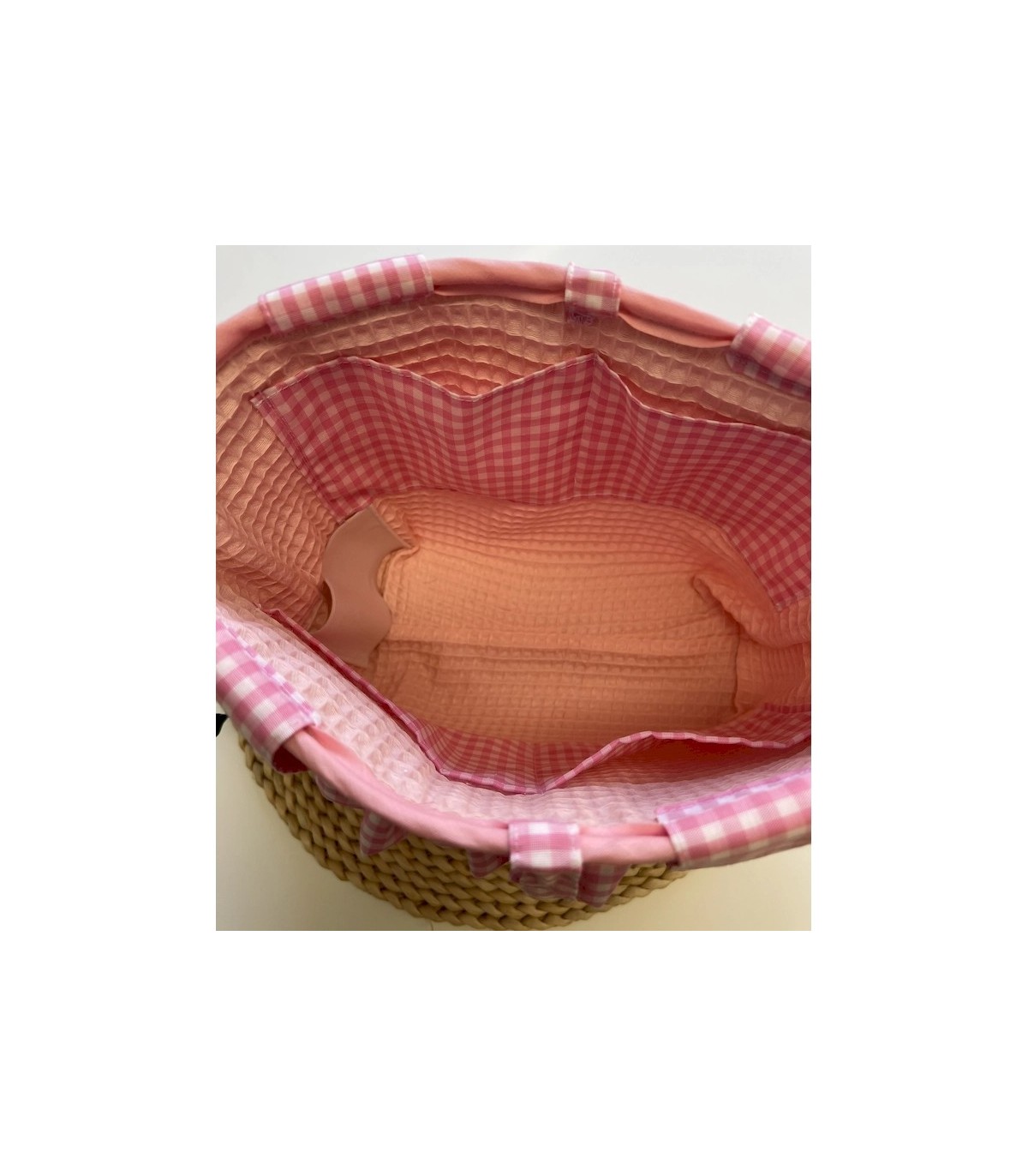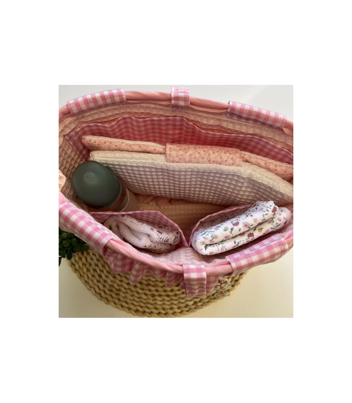 En el interior, está forrado en tejido waffle rosa, suave, con bolsillos interiores que permiten mantener todo bien organizado: pañales, toallitas y más. También lleva un elástico ancho en un lateral del bolso para sujetar biberón, termo, dosificadores de comida... El bolso cuenta con cierre de lazos de la misma tela vichy para darle otro estilo.