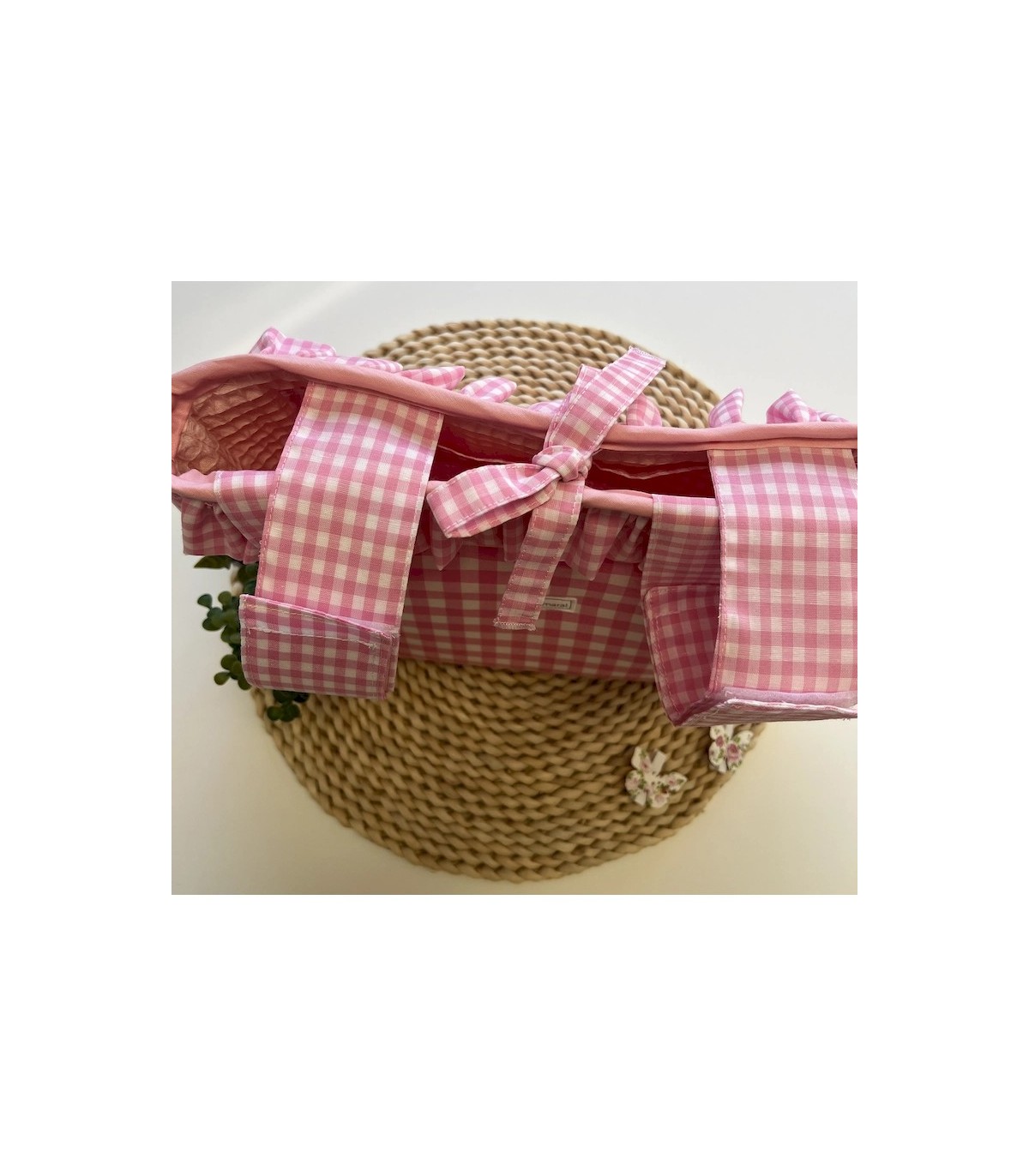 Este bolso bombonera para carrito está confeccionado a mano con un precioso tejido vichy rosa, aportando un toque clásico y dulce al paseo del bebé.