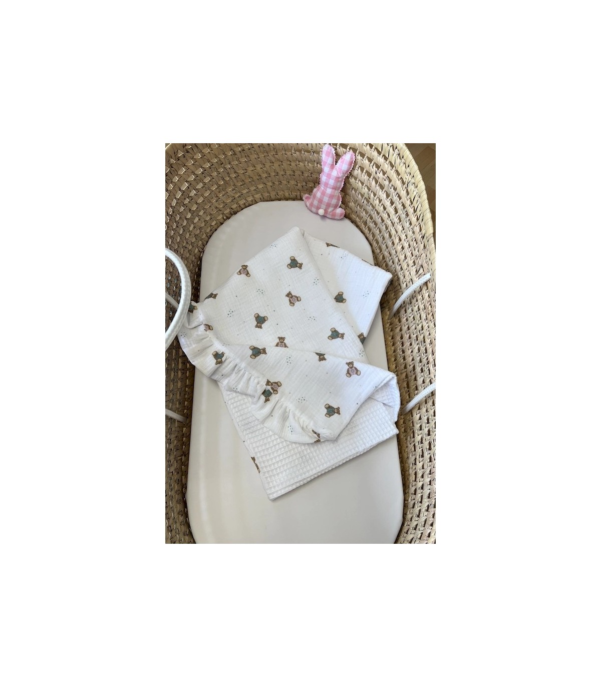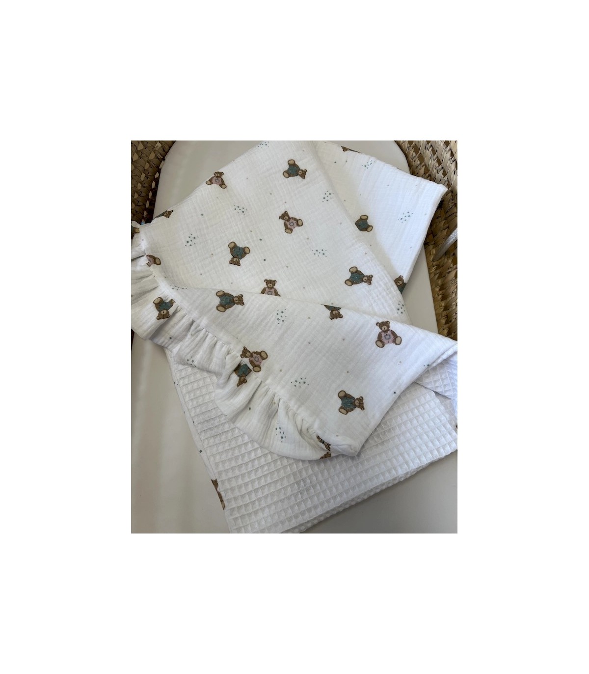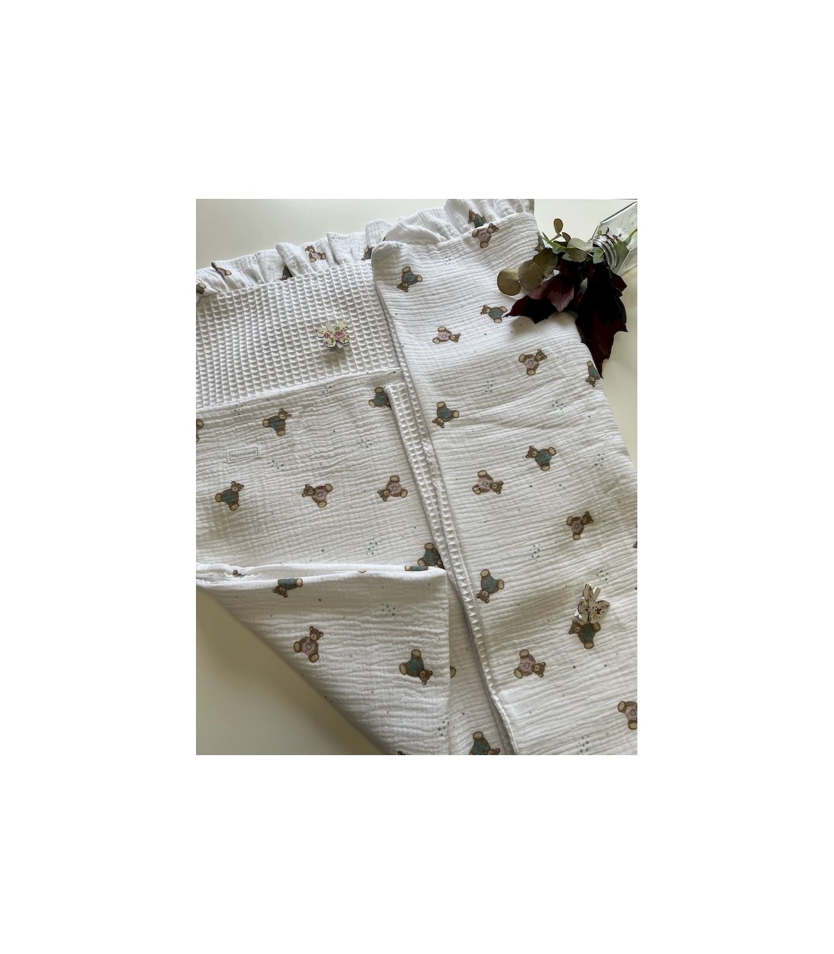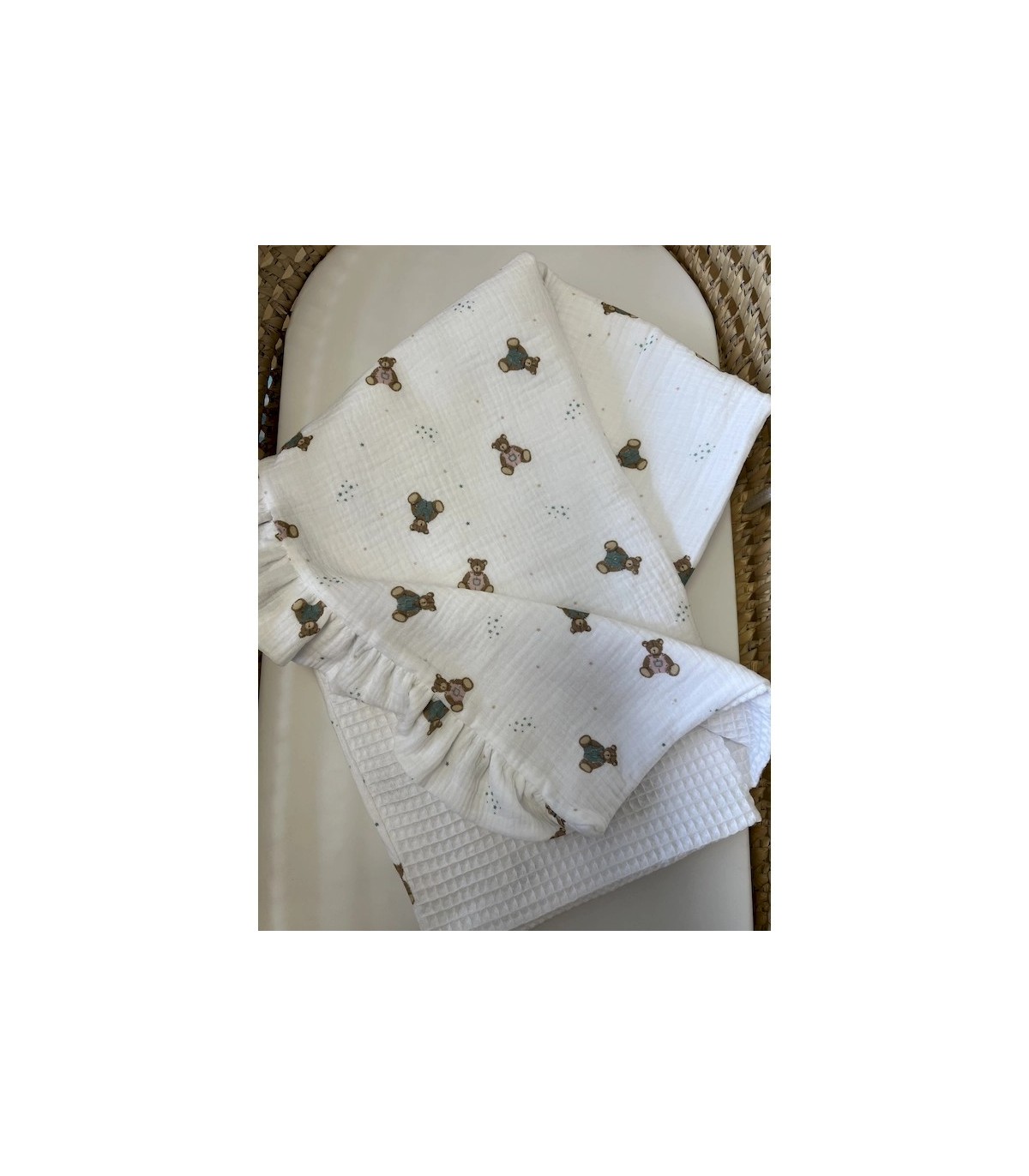 Mantita hecha a mano con muselina de algodón estampada con ositos y reverso de waffle blanco. Suave, acogedora y con un bonito volante en la parte inferior. Medidas: 1,00x70 cm.
