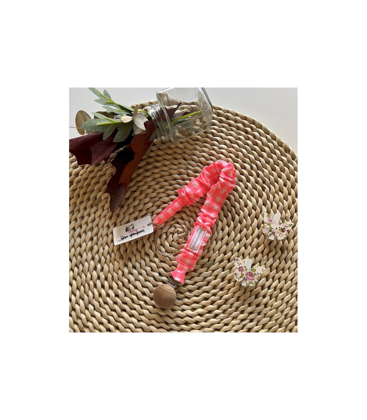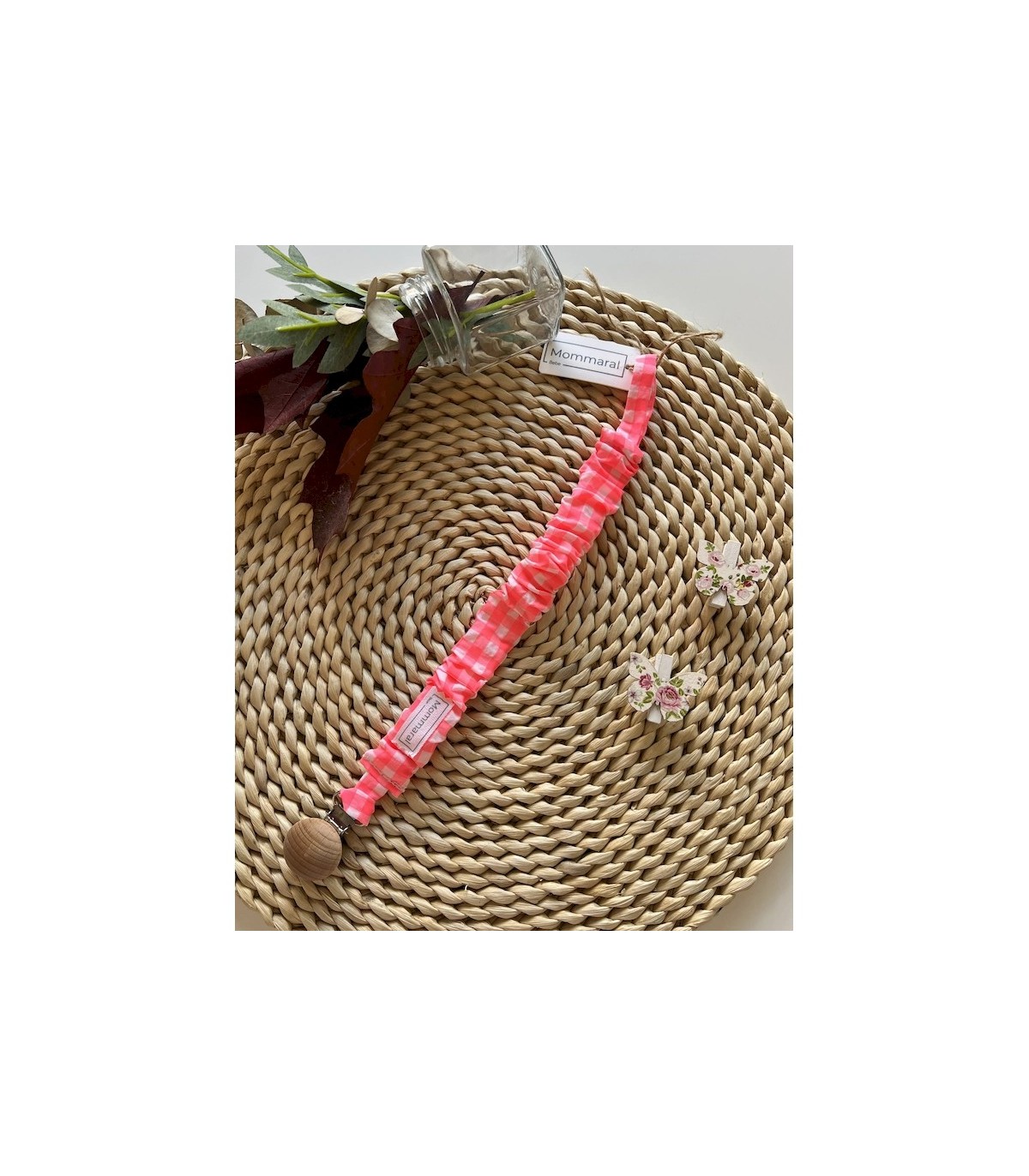 Chupeteros hechos a mano por Mommaral Bebe, confeccionados con tela Vichy rosa flúor 100% algodón. Incluyen una goma elástica suave para bebés y un clip de madera, asegurando comodidad y sujeción segura.