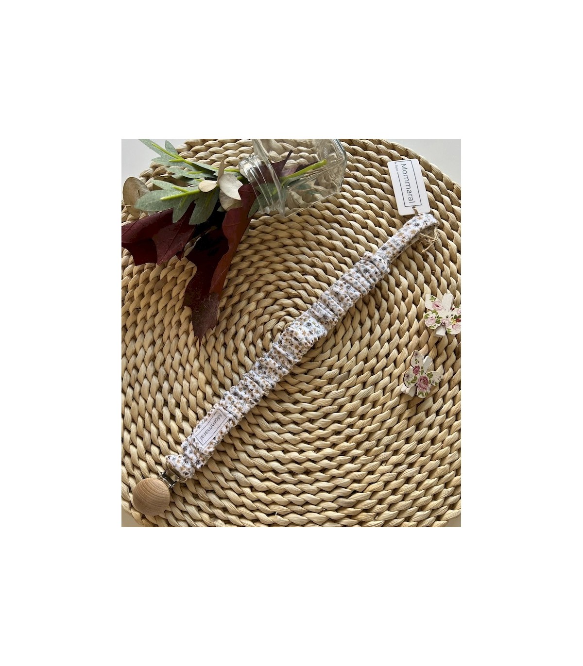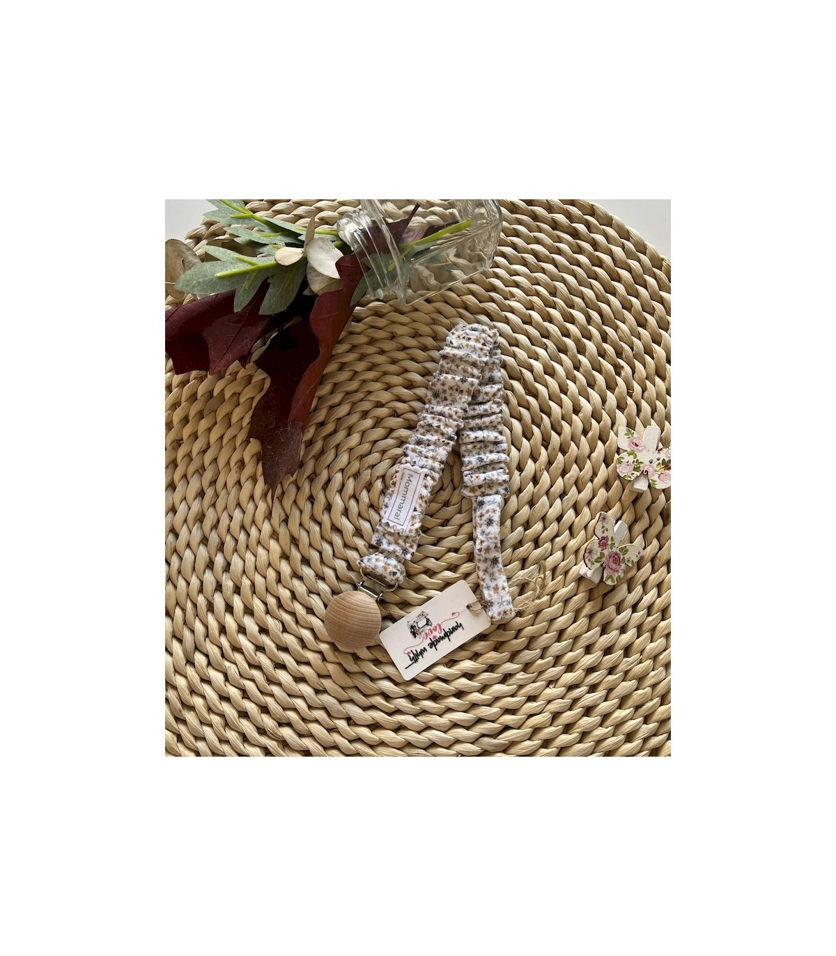 Chupeteros hechos a mano por Mommaral Bebe, confeccionados con muselina 100% algodón. Incluyen una goma elástica suave para bebés y un clip de madera, asegurando comodidad y sujeción segura.