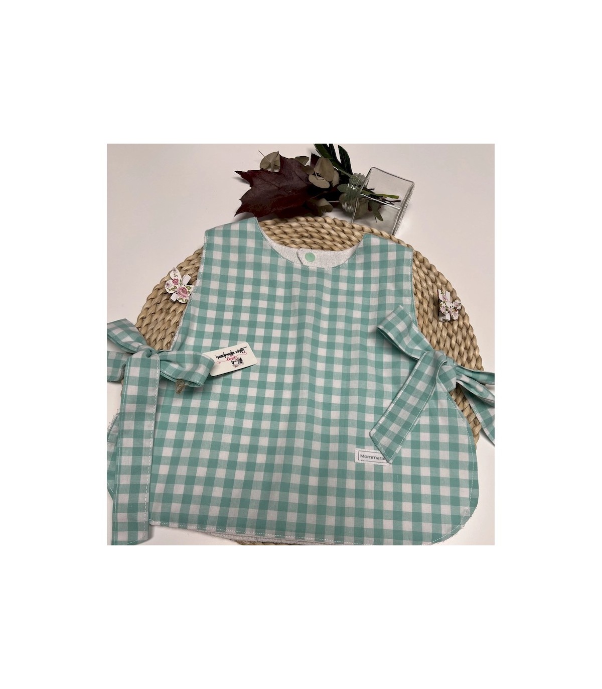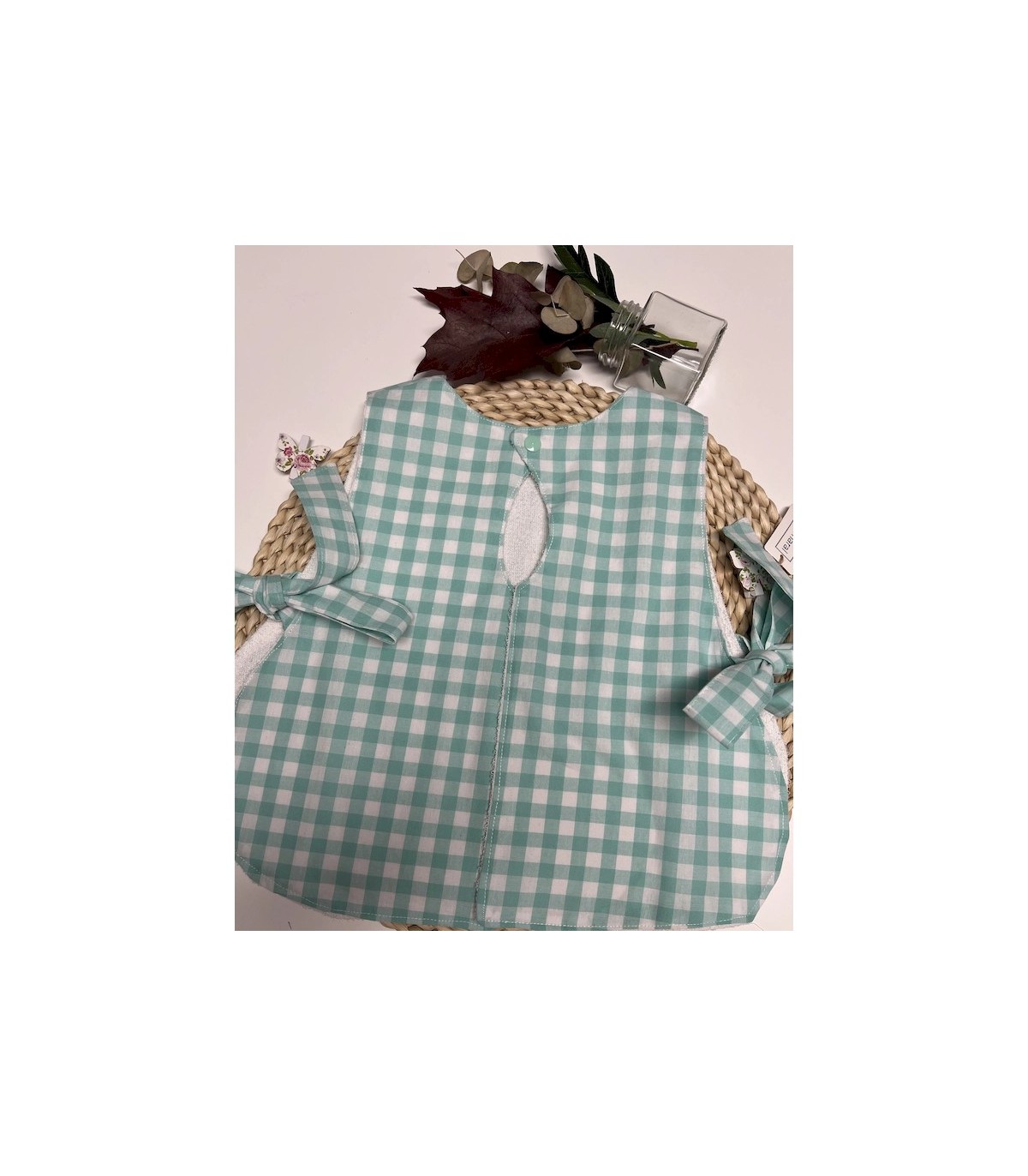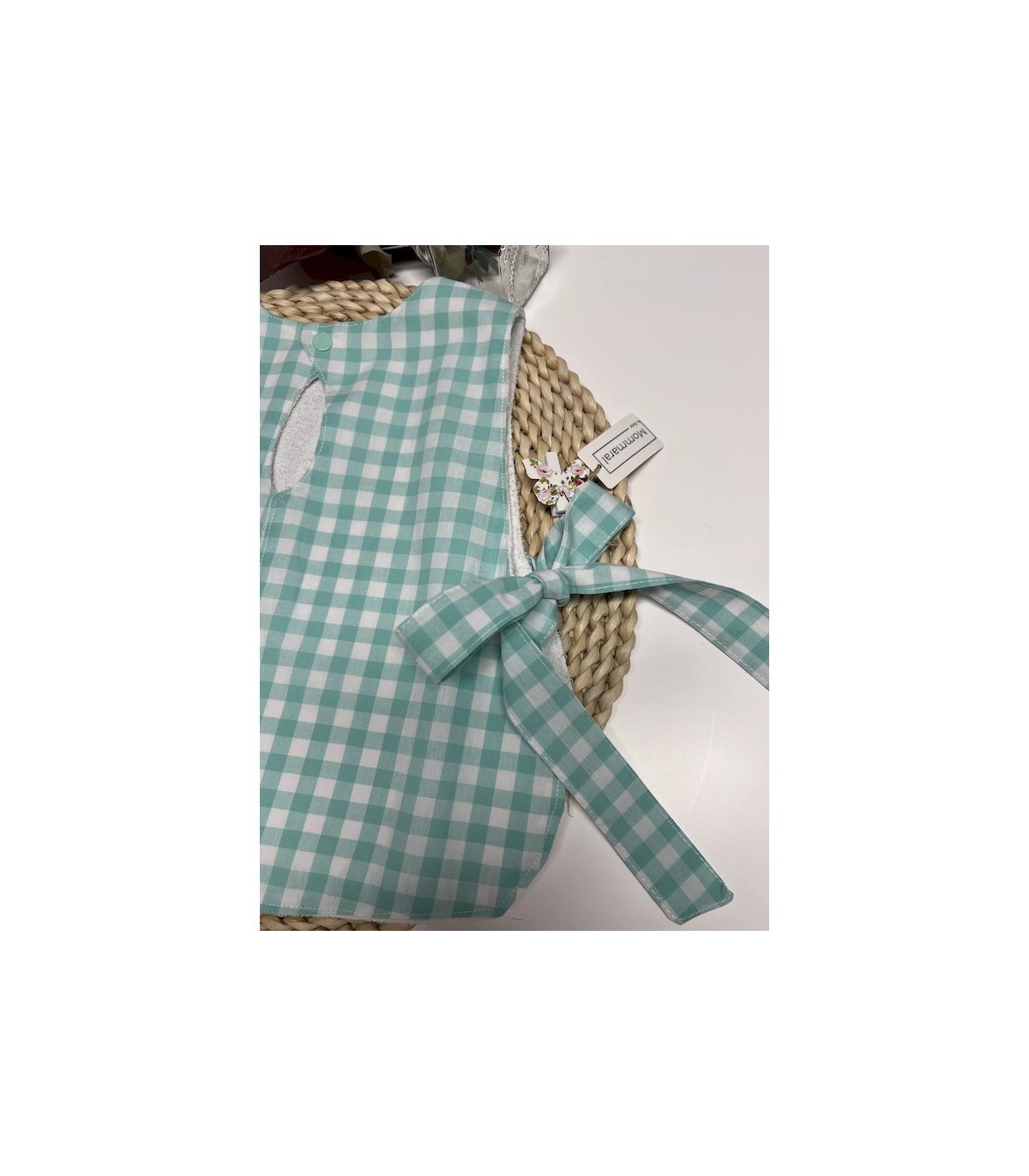 Nuestro babero impermeable vichy verde mar combina practicidad y encanto a partes iguales. El tejido exterior es de algodón 100%, suave y agradable al tacto, con un delicado color verde mar que enamora. En el interior, lleva un forro de algodón 100% impermeable, que evita que la humedad traspase y mantiene la ropita del bebé siempre seca.