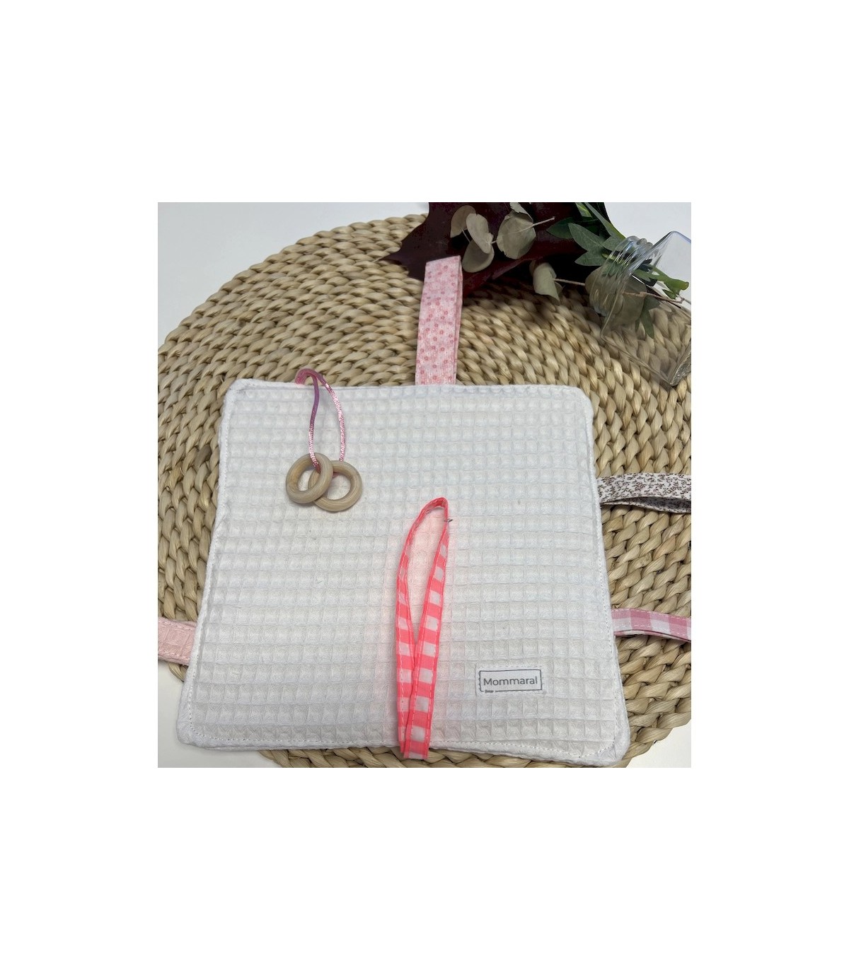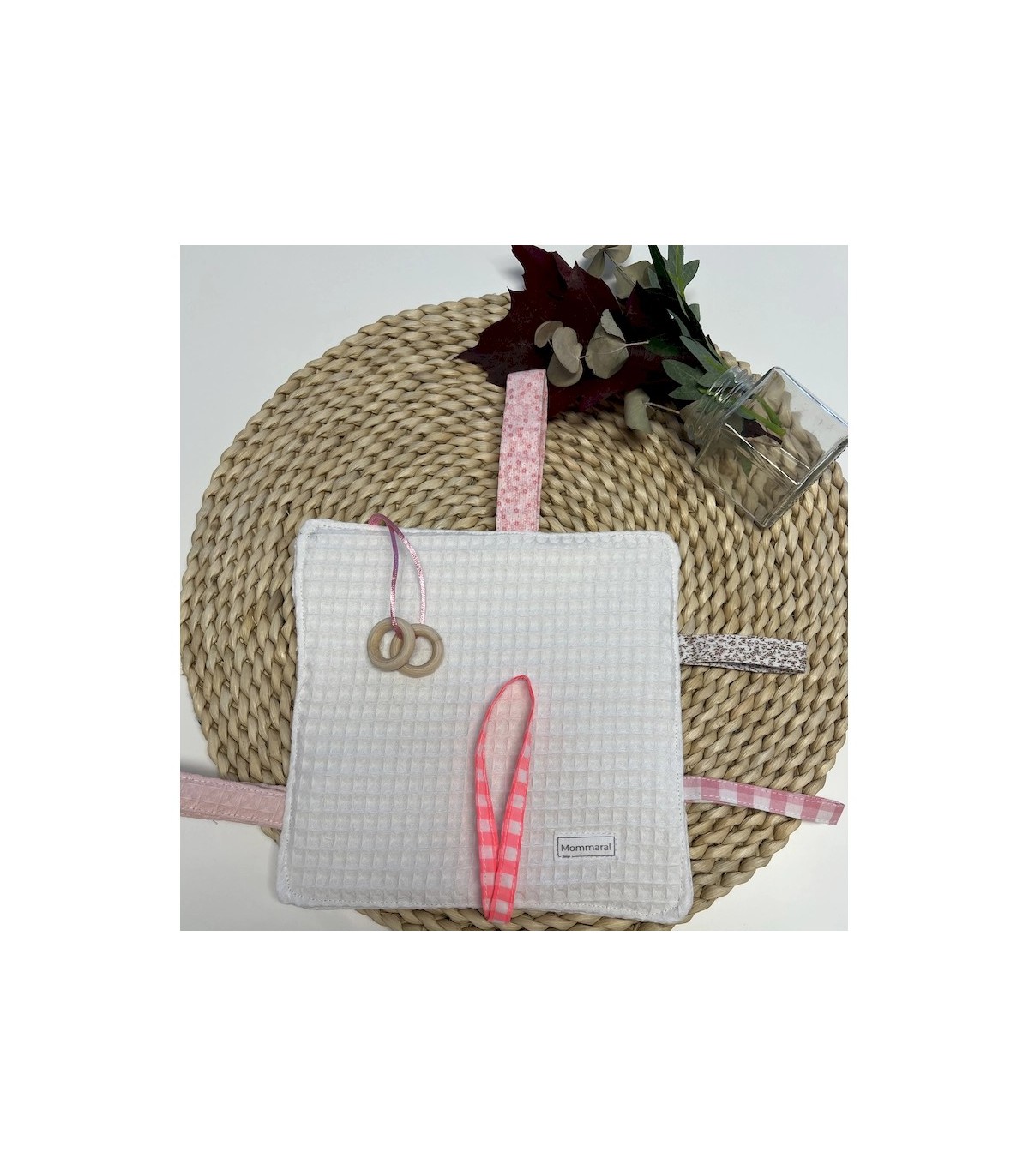 Este trapito sensorial, hecho a mano por Mommaral bebe, está diseñado para acompañar a tu pequeño en sus primeras exploraciones sensoriales. Combina diferentes texturas de telas, anillitas naturales natural de madera, creando una experiencia llena de estímulos para el tacto, el oído y la curiosidad del bebé.