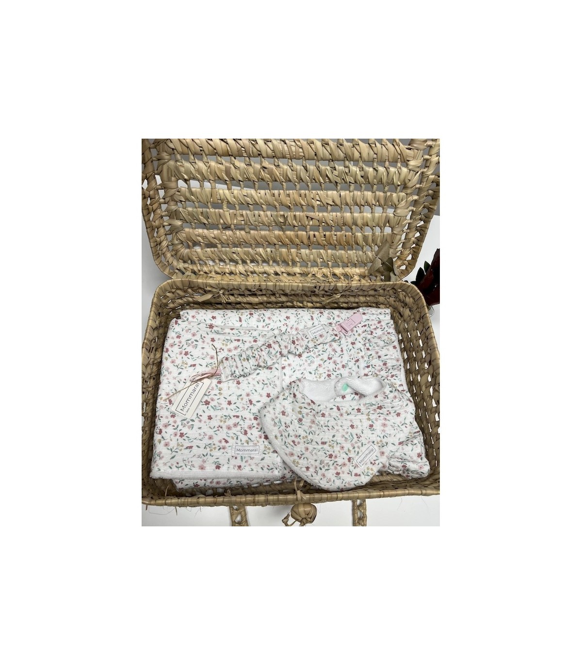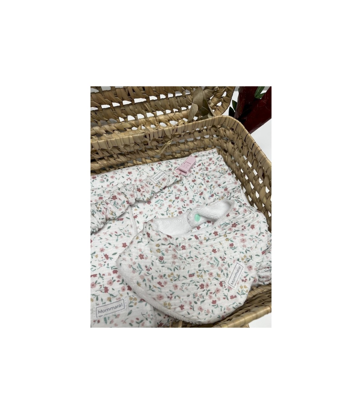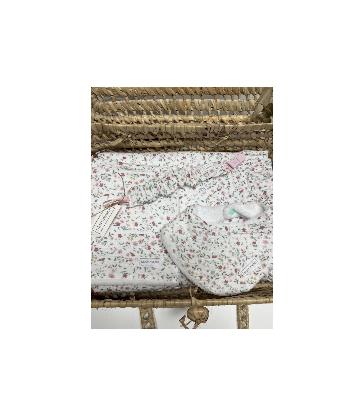 Cesta de Regalo “Flores y Bambú” de Mommaral Bebe. incluye manta, babero, toallita y chupetero hechos a mano con muselina de flores y rizo de bambú. Materiales naturales, suaves e hipoalergénicos. Presentación en maleta de mimbre. Ideal para regalo de nacimiento.