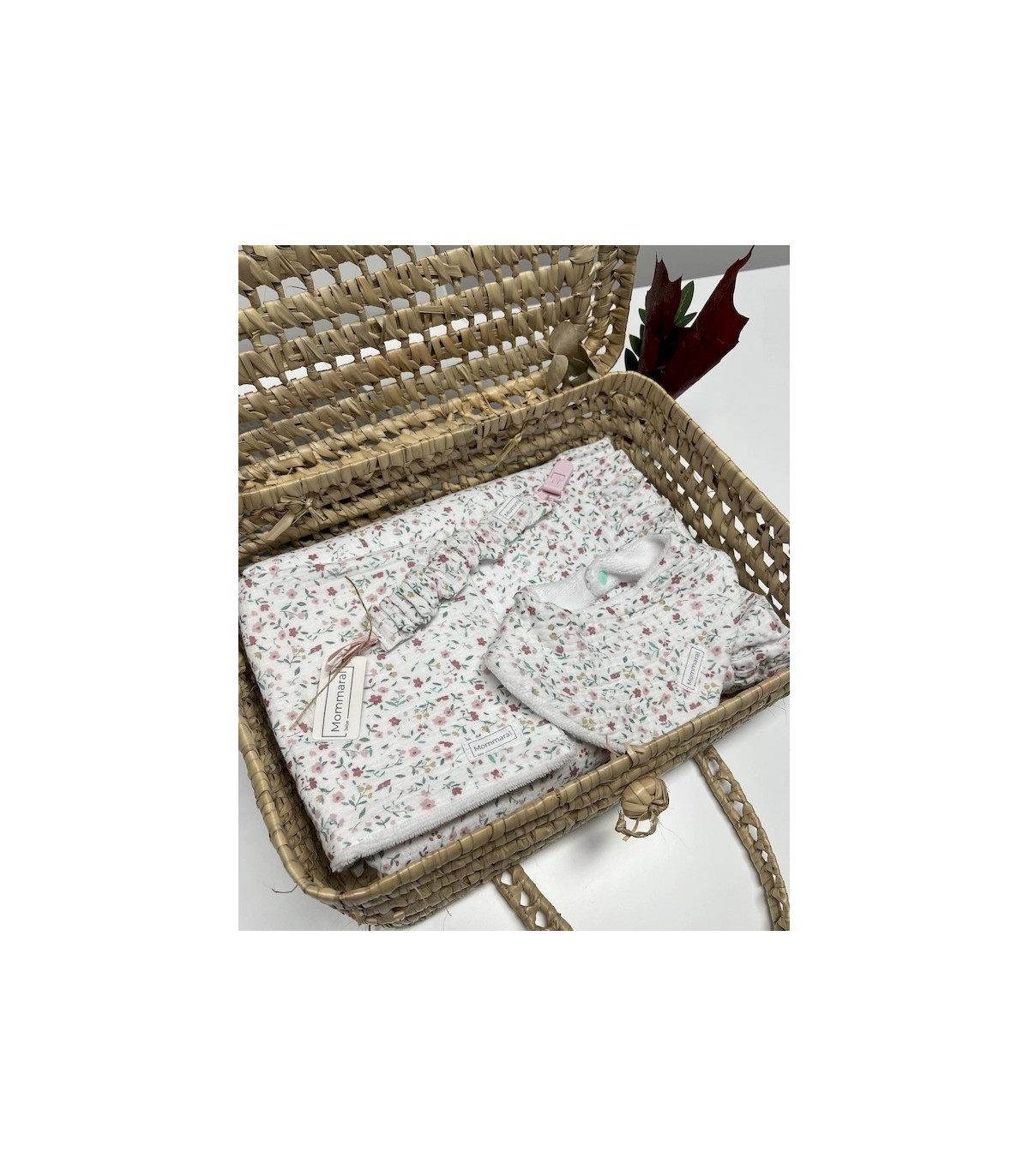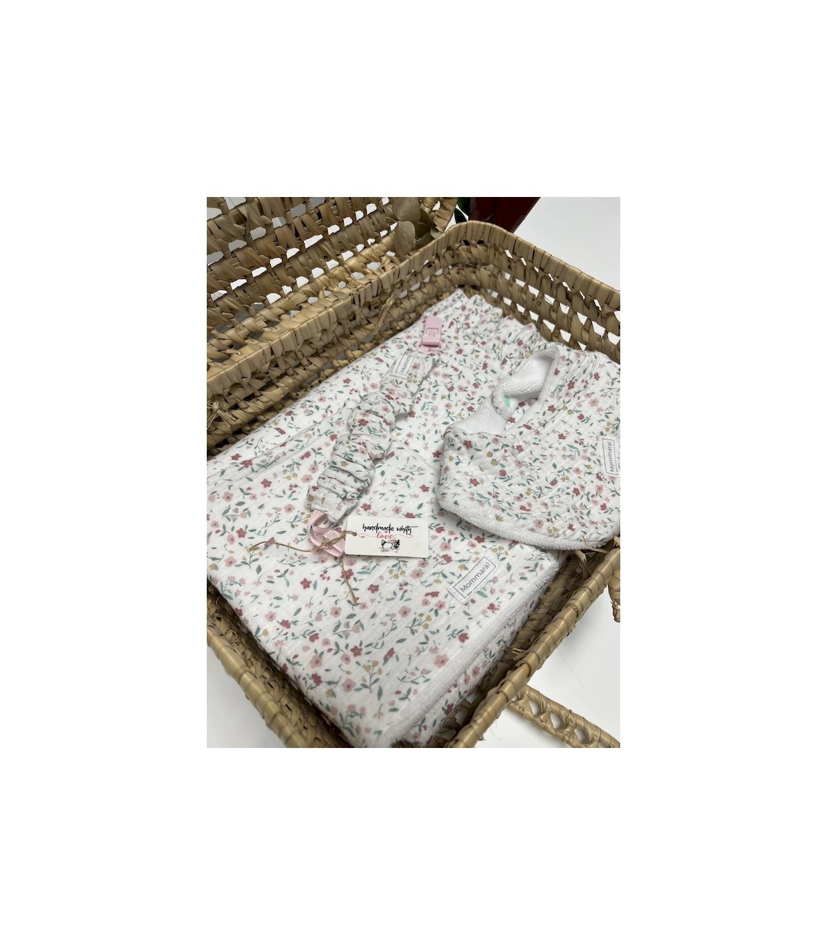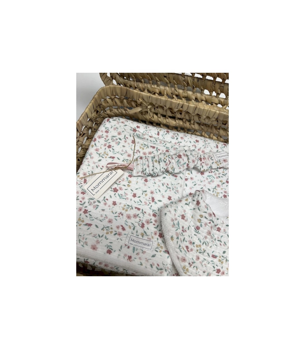 Cesta de Regalo “Flores y Bambú” de Mommaral Bebe. incluye manta, babero, toallita y chupetero hechos a mano con muselina de flores y rizo de bambú. Materiales naturales, suaves e hipoalergénicos. Presentación en maleta de mimbre. Ideal para regalo de nacimiento.