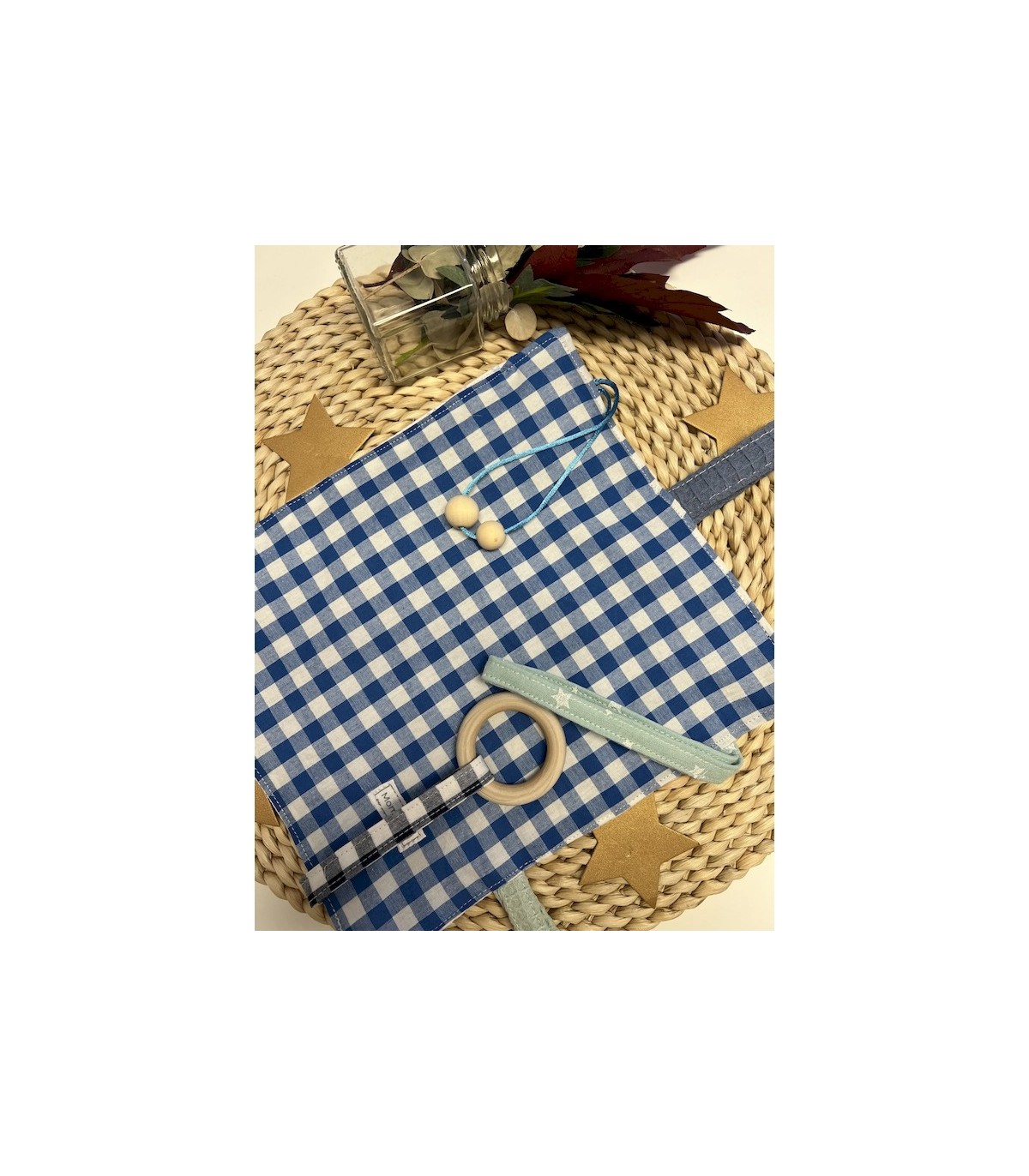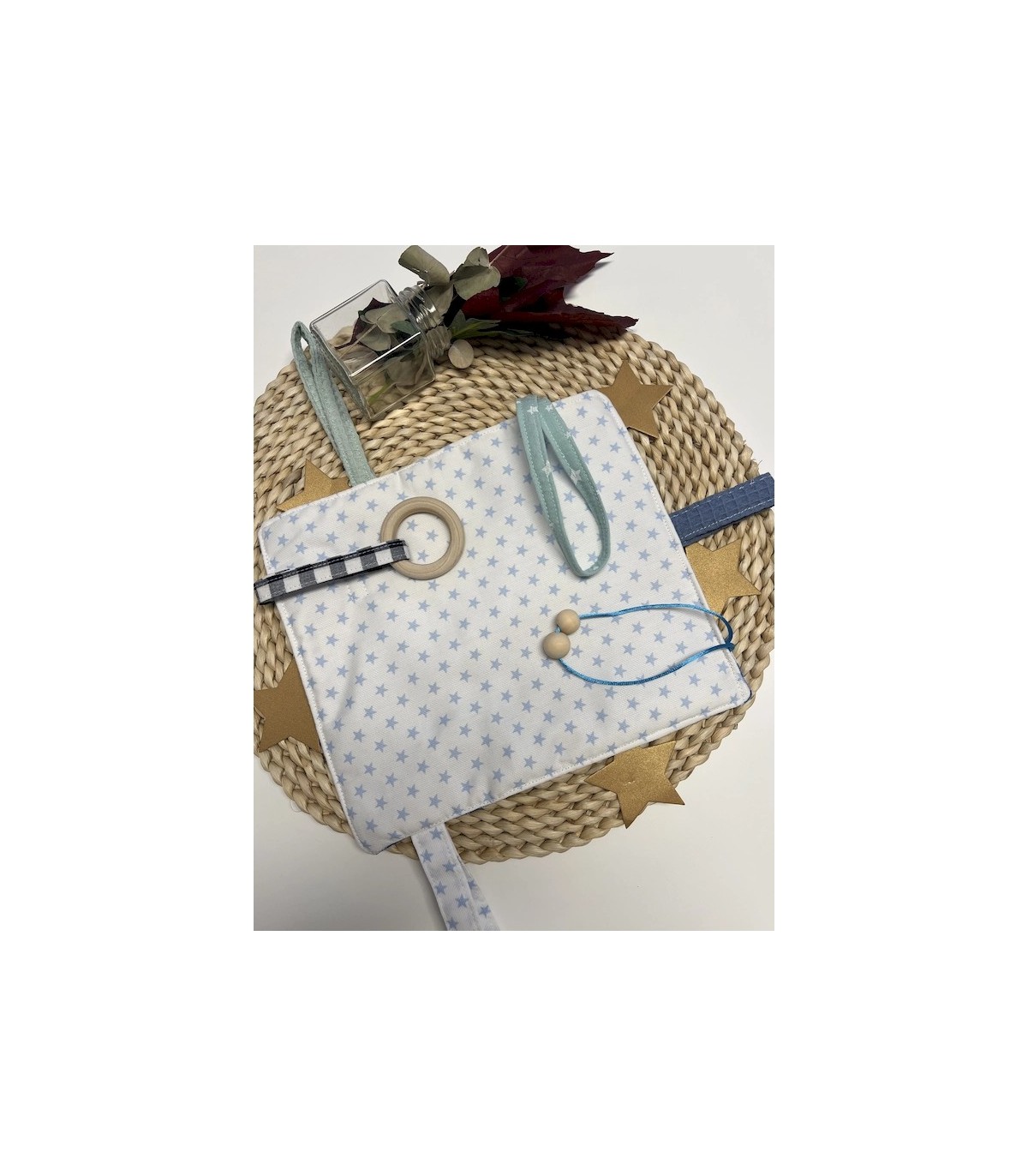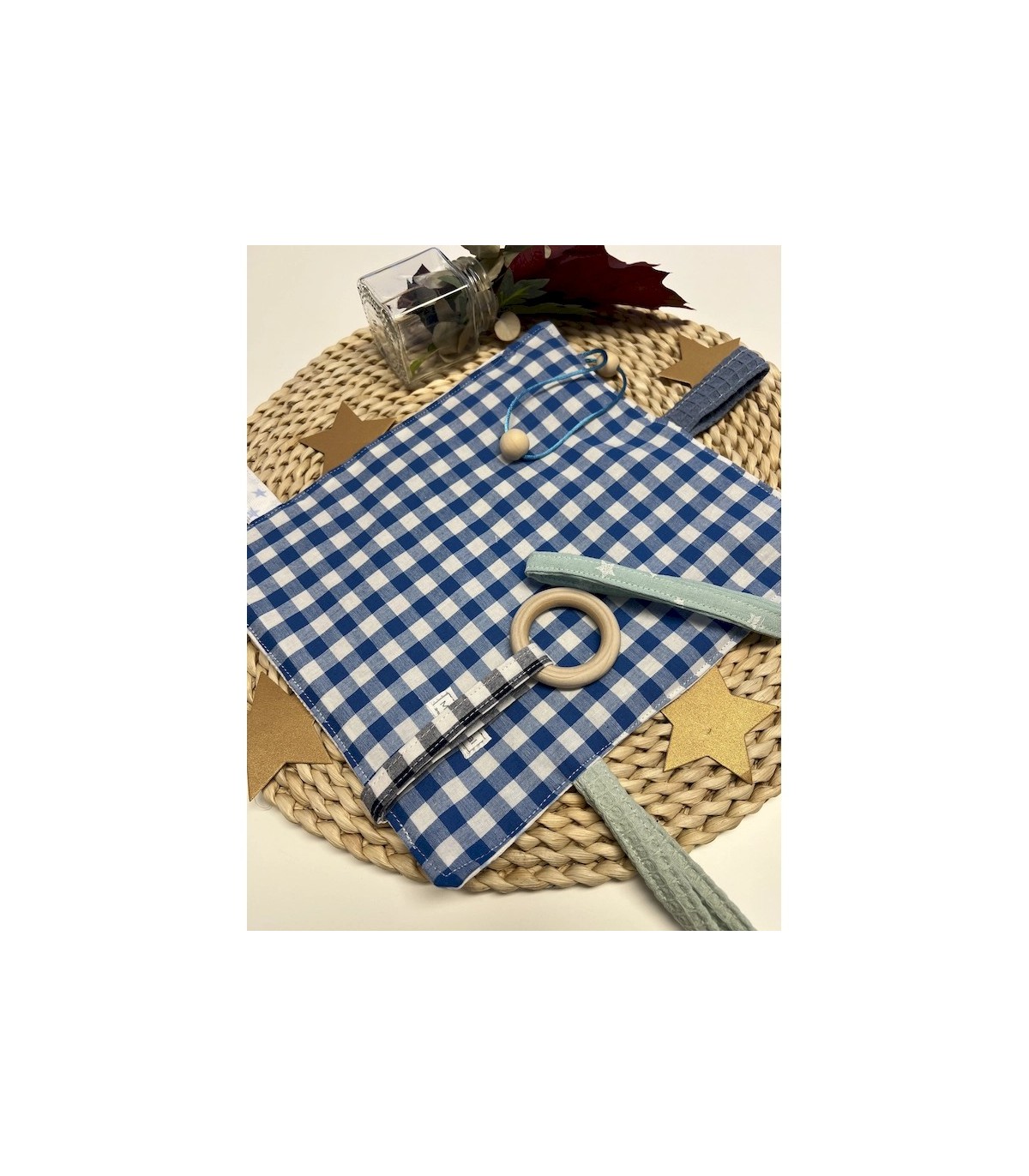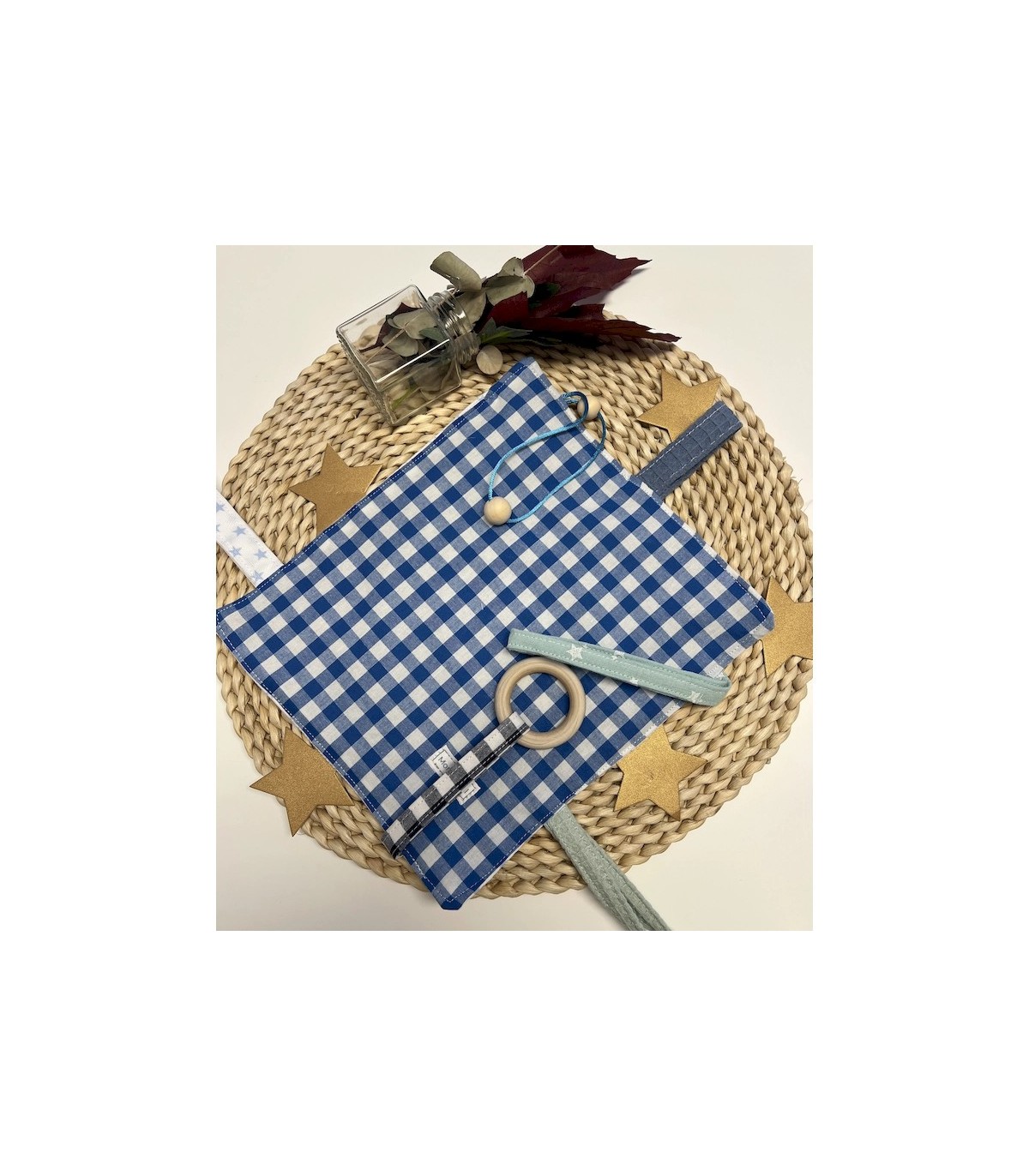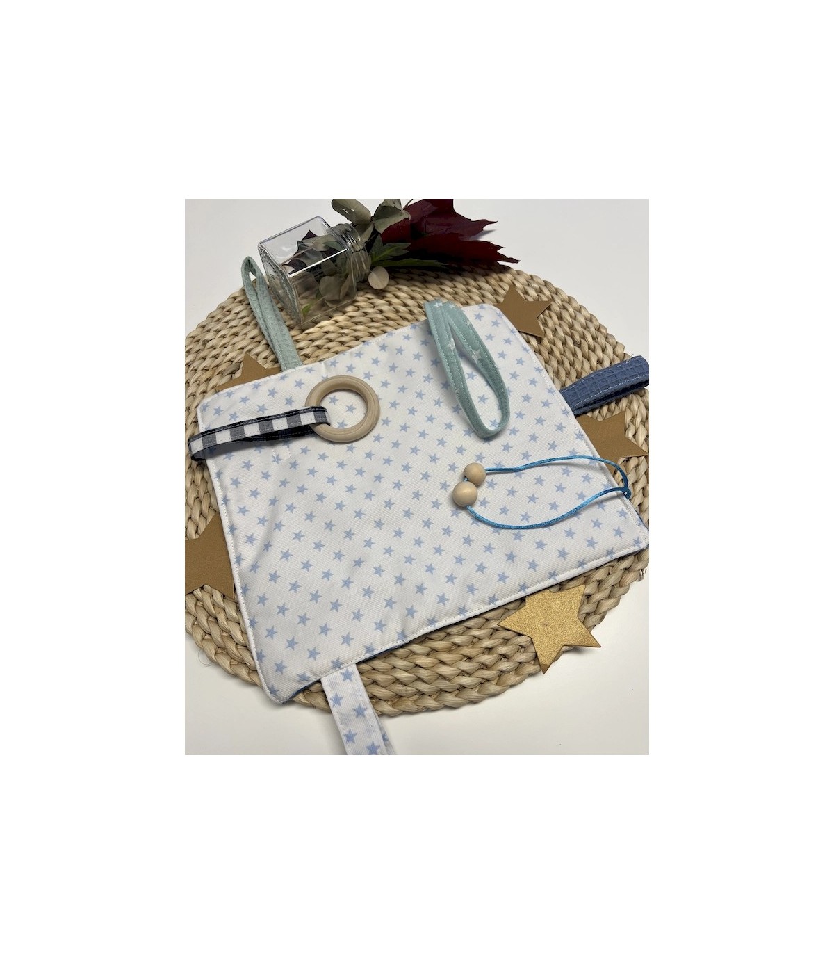 Confeccionado con una preciosa tela vichy en azul por una parte y de estrellas por la otra parte, es un regalo ideal para fiestas o un detalle especial para tu bebé. Cada pieza se elabora con mimo, cuidando la seguridad y el confort de los más pequeños.
